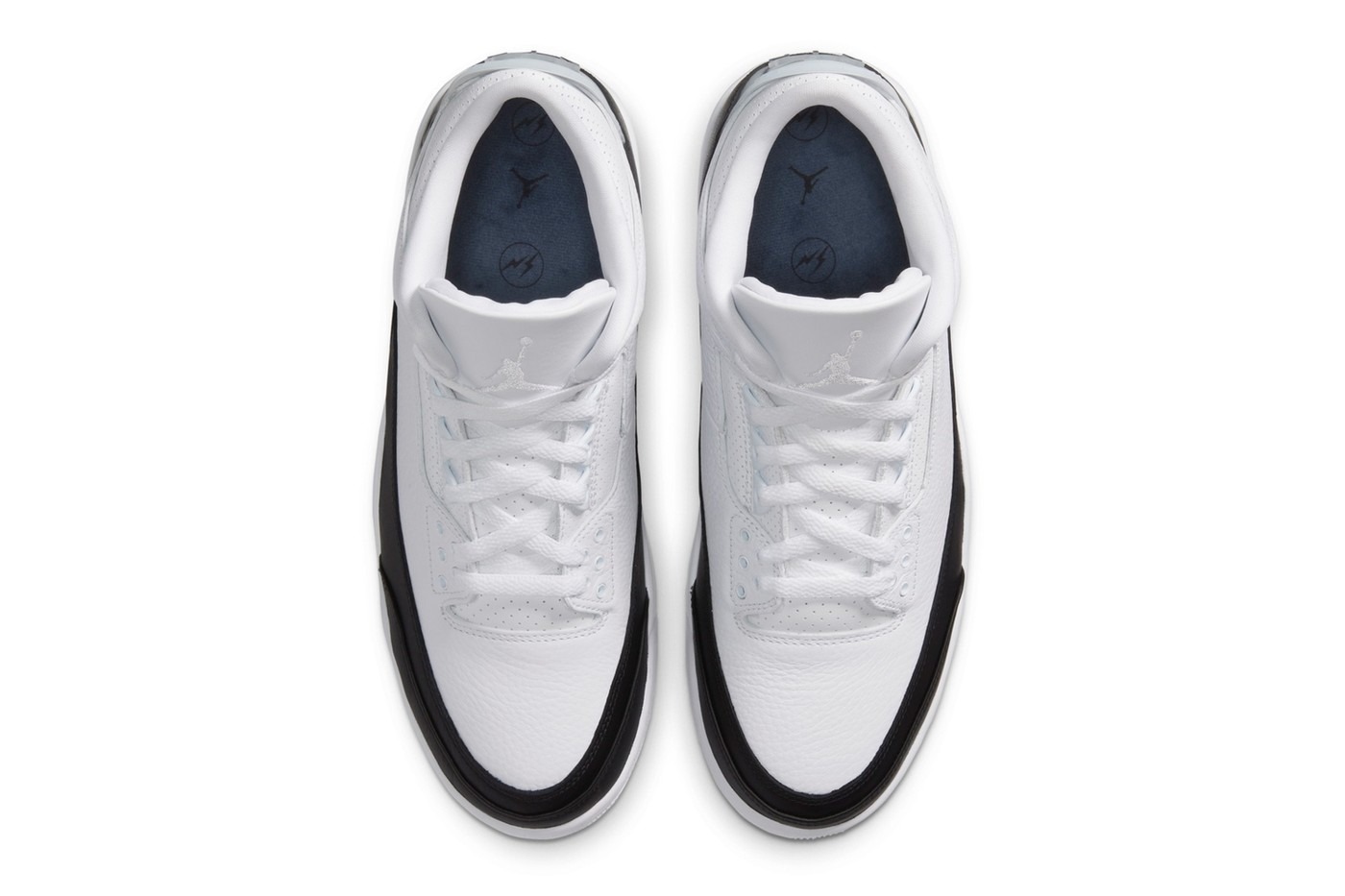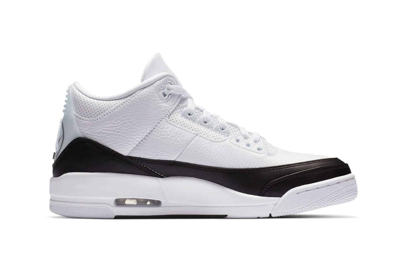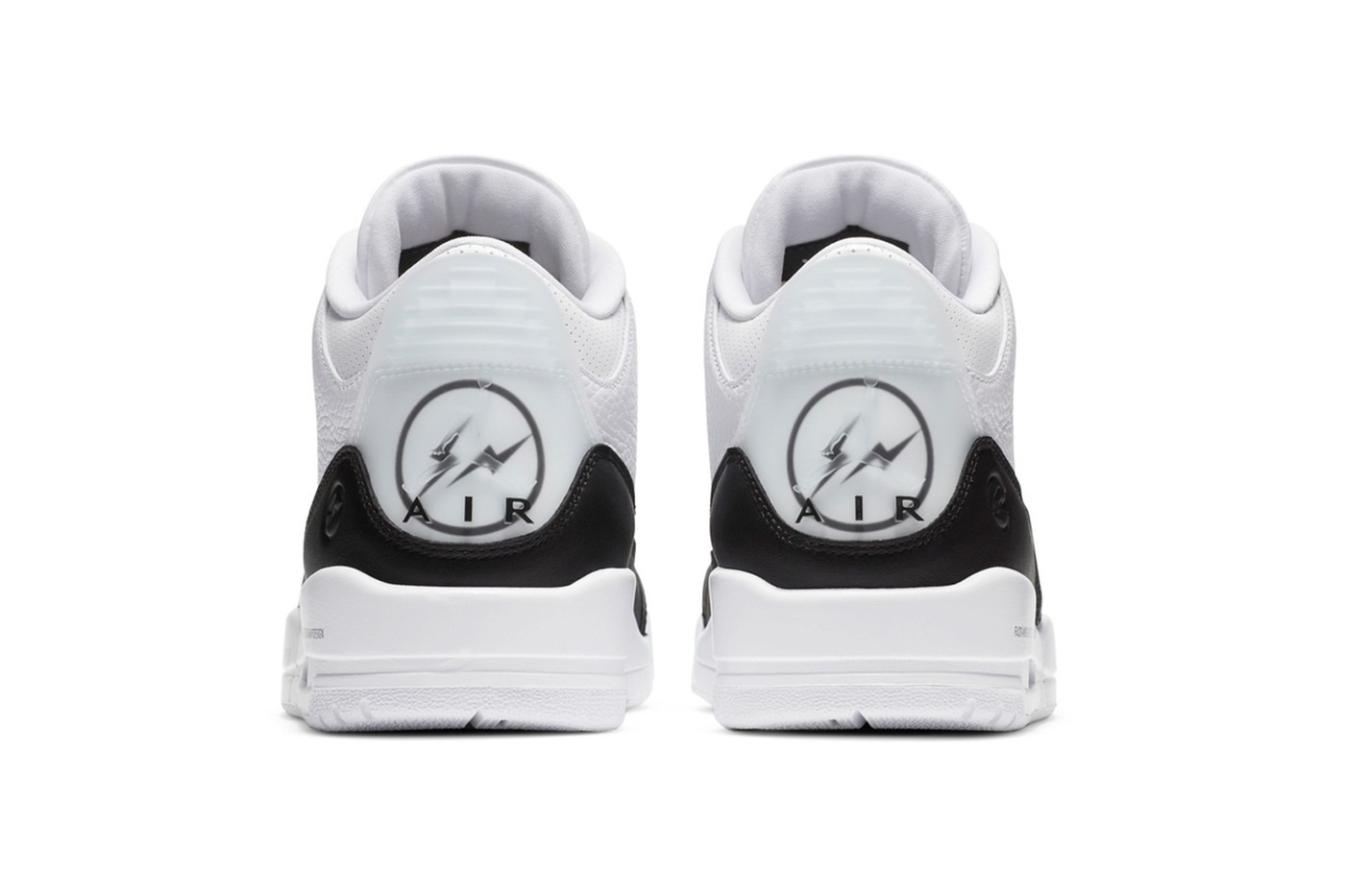 We’ll be honest here, this monochrome color scheme isn’t gonna make anyone jump over the moon. But it does feature welcomed touches that make this a sneaker worth picking up. The fragment design x Air Jordan 3 Retro SP features white tumbled leather on the upper. Along with smooth black leather featured on the toe, heel and mudguard. You’ll find the fragment thunderbolt logo debossed at the heel as expected. With a white embroidered Jumpman design on the tongue. The most notable feature is the large fragment design logo covered by a translucent Jumpman found on the heel. Elevating the collaboration is a clean Air-assisted white midsole marked with technical data and paired with a matching white rubber outsole.