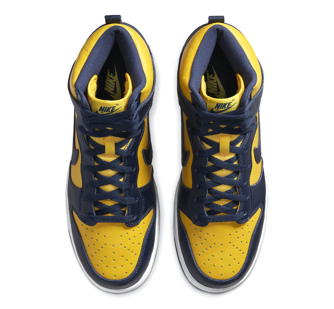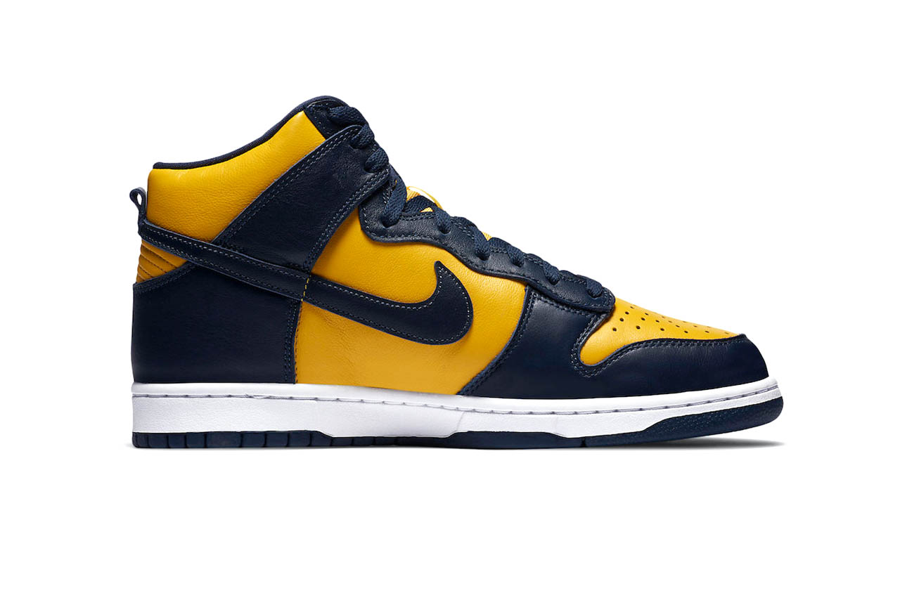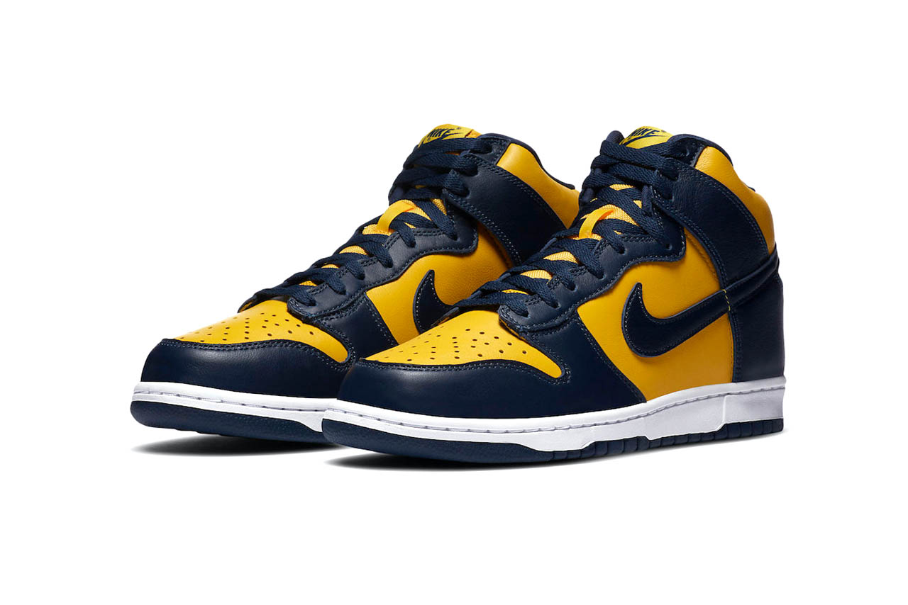 The unexpect resurgence of the Nike Dunk came shortly after Virgil Abloh released the coveted Off-White™ collection of Nike Dunk Low’s. With that collaboration, we saw the low iteration of this sneaker. Well, the hype continues, but this time for the Nike Dunk High. We recently covered the “Pro Green” colorway set to release September 18. This time Nike re-introduces one of its most popular colorways for any sneaker with the Nike Dunk High “Michigan”. This will be the second Nike Dunk High to release in 2020.