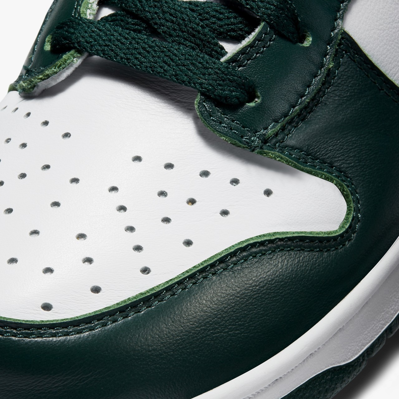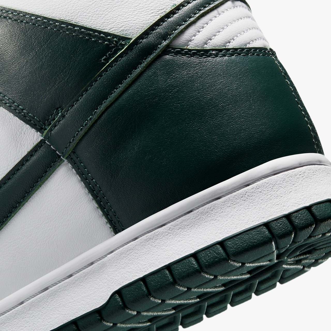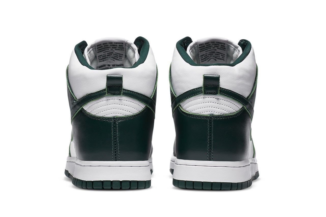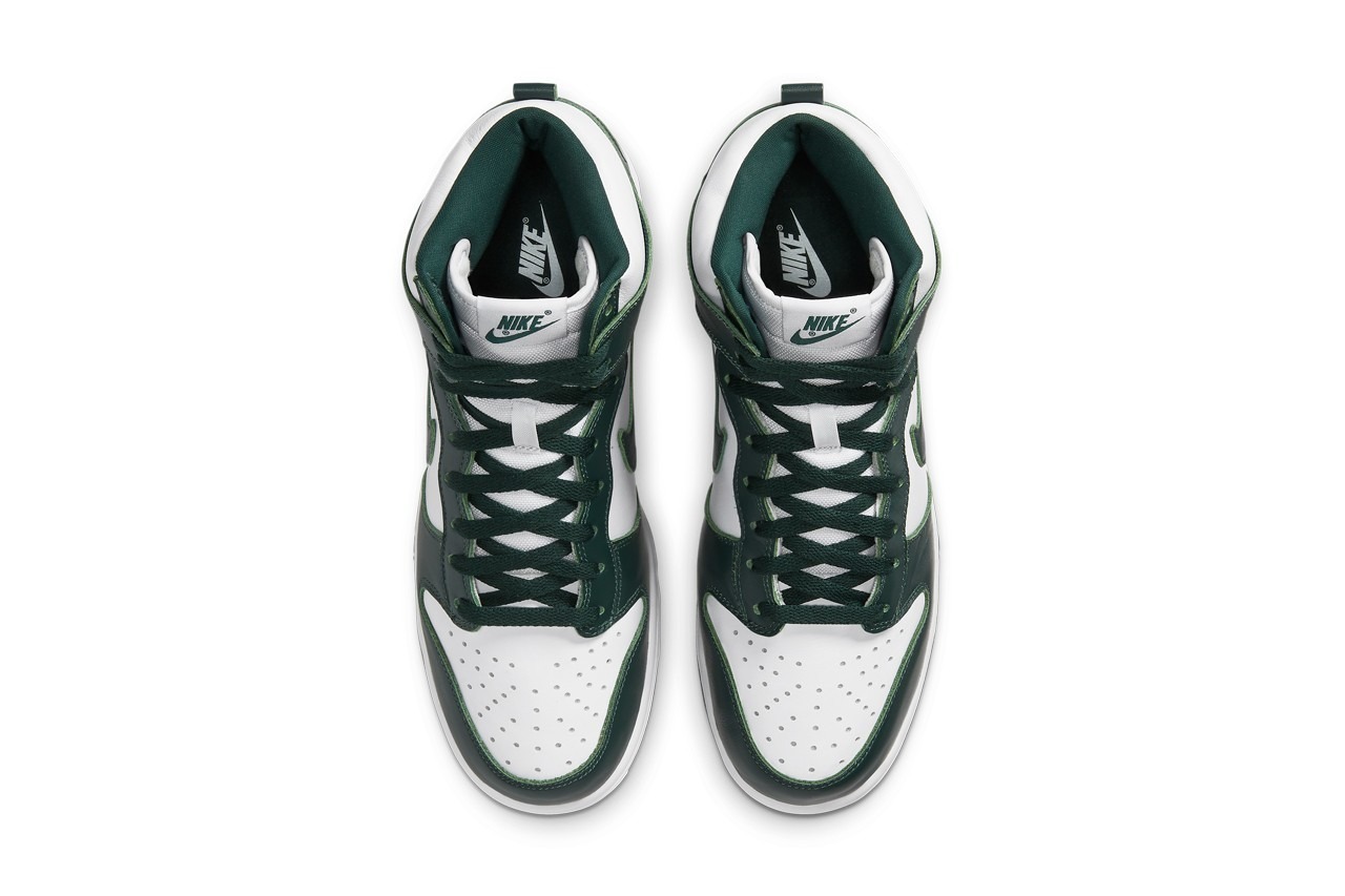 The shoe is simplistic, featuring a white- and green-colored upper, similar to the “Pine Green” Nike Dunk High’s that dropped in 2008. With a few differences. For starters, the shade of green is much darker on this pair. The toe boxes, quarter panels, collars and tongues all feature white, while dark green hue sits on the mudguards, eyestays, Swooshes and collar flaps. We find this same hit of green on the tongue tag. Nike rounds off the look with white midsoles and green outsoles.