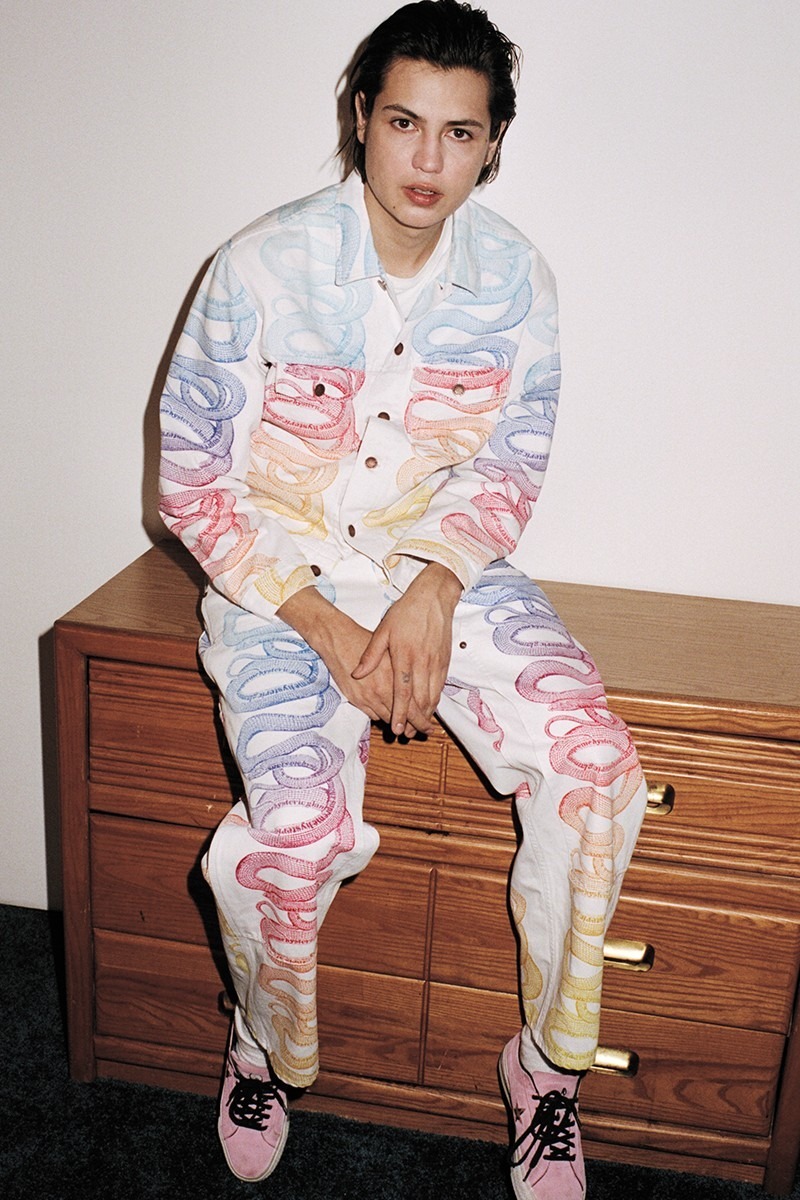 Taking lead on this collection is a take on HYSTERIC GLAMOUR’s grailed Artisinal Snake Print. Which comes as a Trucker Jacket, matching Painter Pants and Crusher come in three colorways. The collection also features a lux Track Jacket with matching shorts which feature rainbow stripping, this set also comes in three hues.