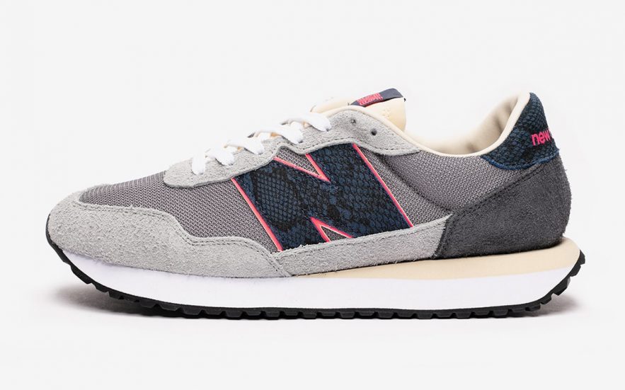 SNS and New Balance collaborate on the 237 silhouette named “Blue Racer.” The inspiration behind the design comes from the Blue-Grey snakeskin of the Blue Racer Snake. The shoe features a light and breathable CORDURA mesh along the upper with suede overlays. Faux Blue Racer snakeskin accents on the “N” and heel tab. Completing the design is the SNS logo placed alongside the New Balance logo on each tongue.
