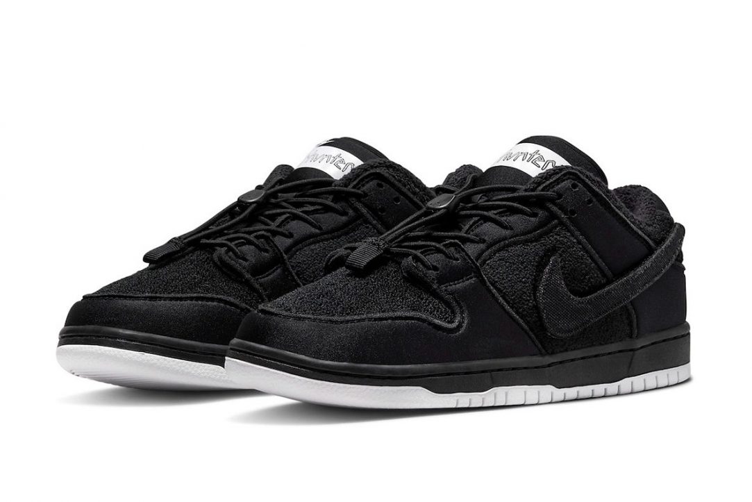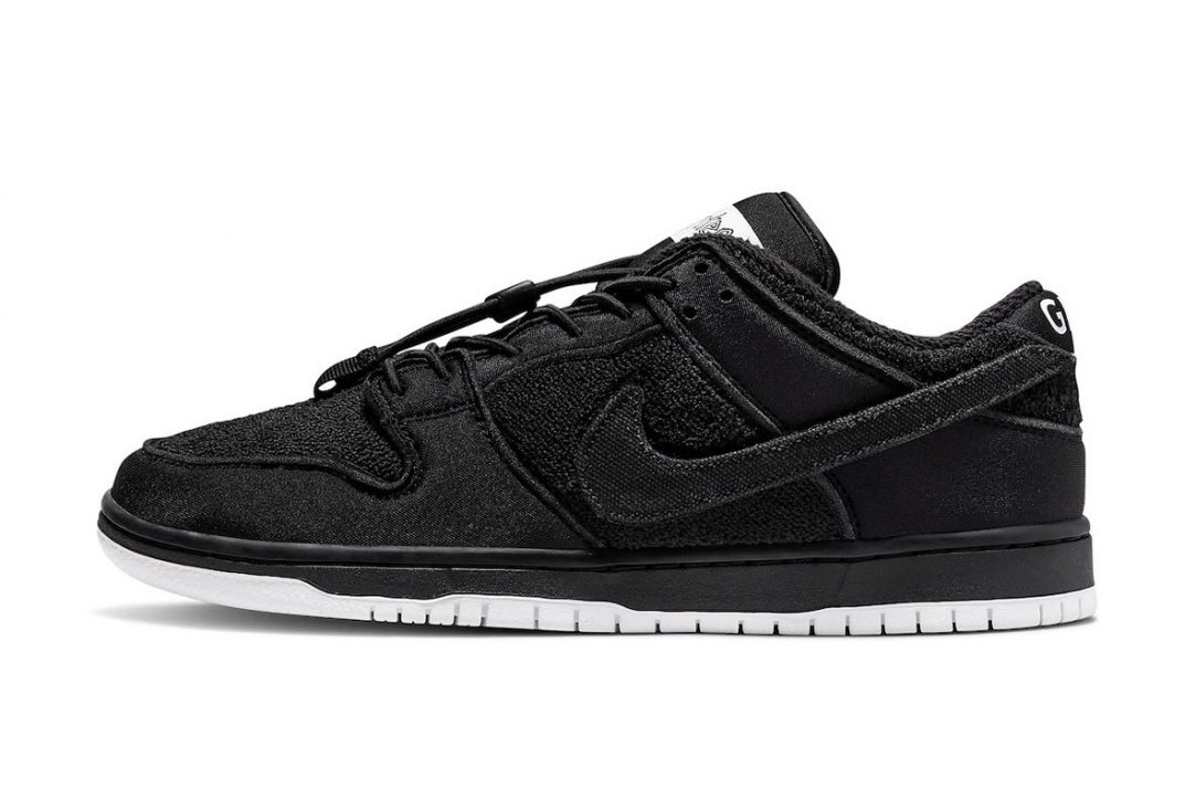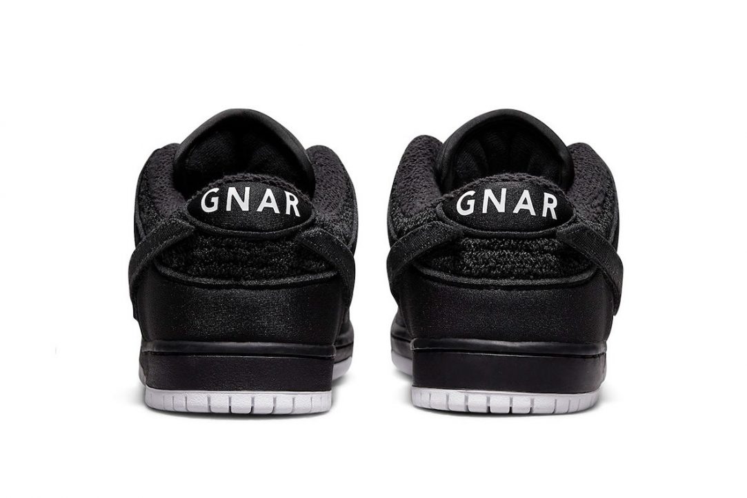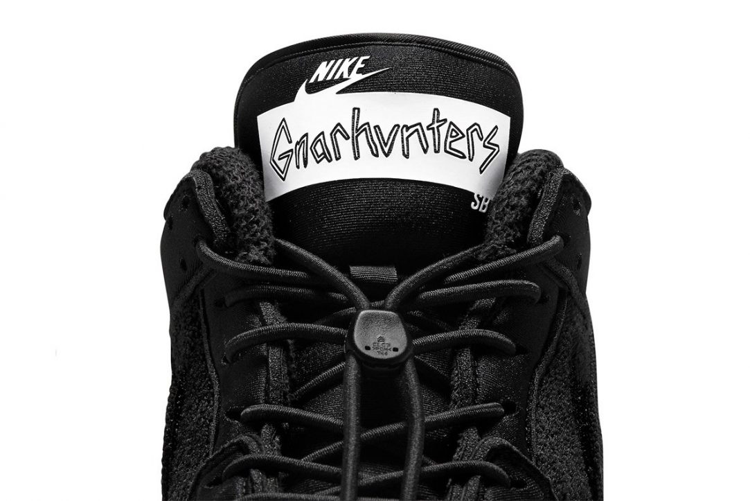 We saw a preview of this a few weeks back, and now we have official images. The shoe features a predominantly black upper of mixed materials. Starting with terry cloth, nylon, leather, and canvas for the removable side Swoosh logo. With only white featured on the outsole for contrast. You’ll find “Gnar” at the heel, and Gnarhunters on the tongue.