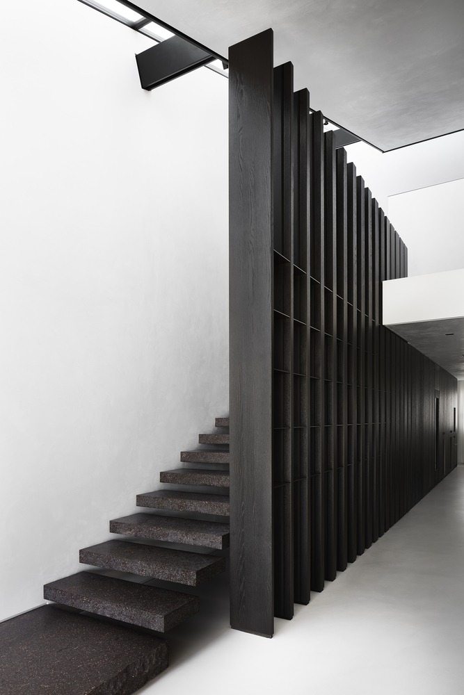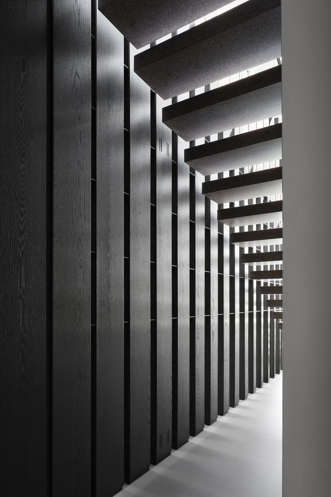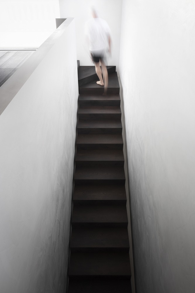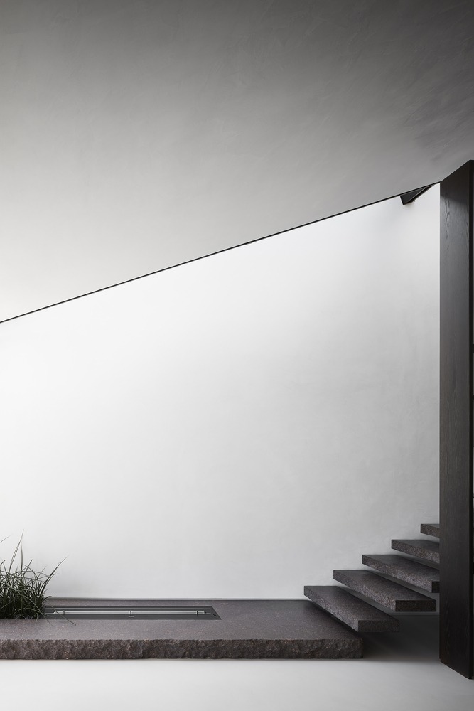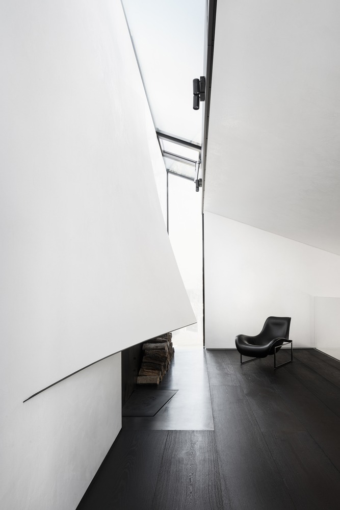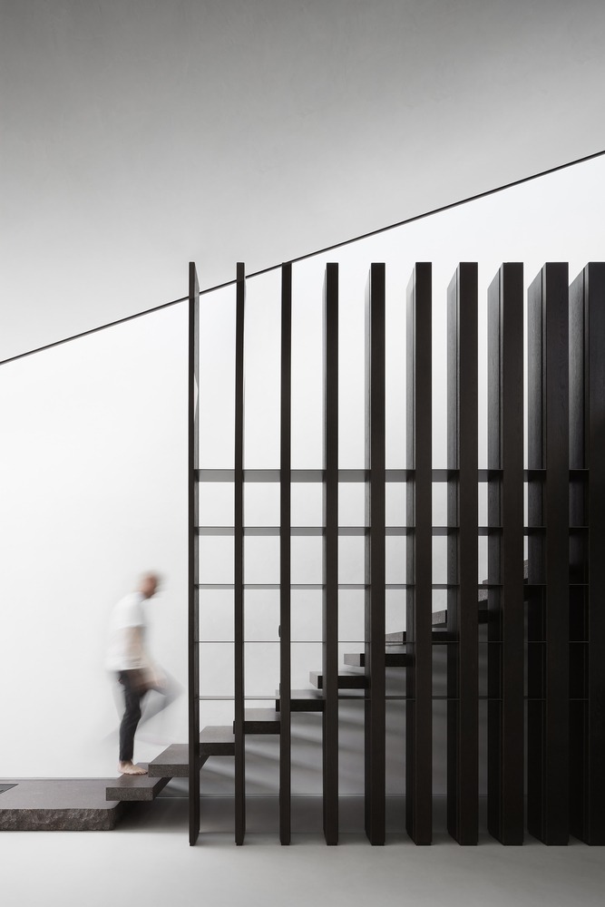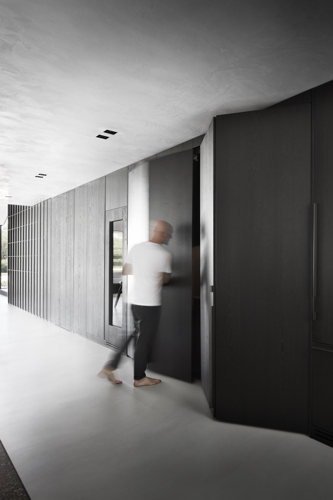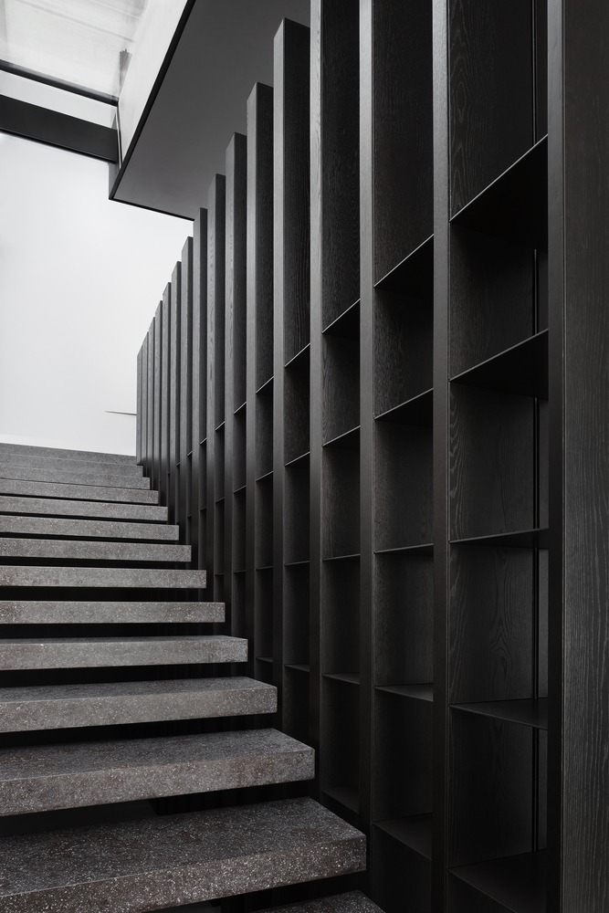 Indoor and outdoor pivoting panels as well as indoor sliding screens allow space reconfiguration and trigger different ways of inhabiting spaces. A 14-meter long double-height oak timber wall (from the certified forest) incorporates different functions: staircase balustrade, mezzanine balustrade, display unit, hidden storage, hidden pivoting door, and hidden kitchen area to serve as a support to the main kitchen island. Unexpected moments are also part of the project, like the ‘peeling off’ of the wall to create the fireplace at mezzanine levels.