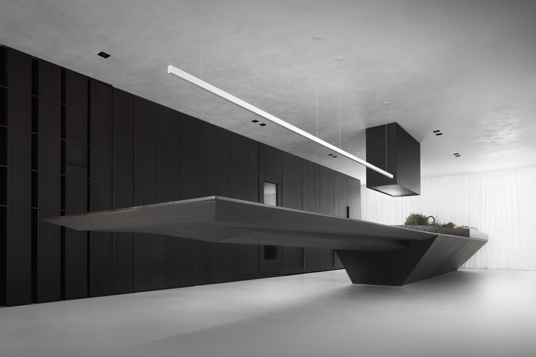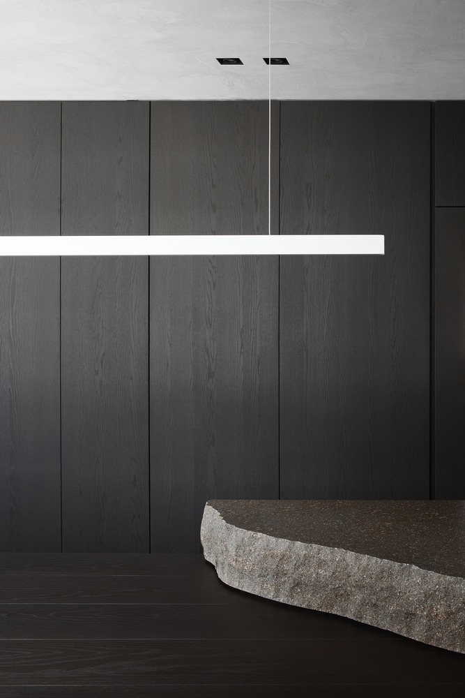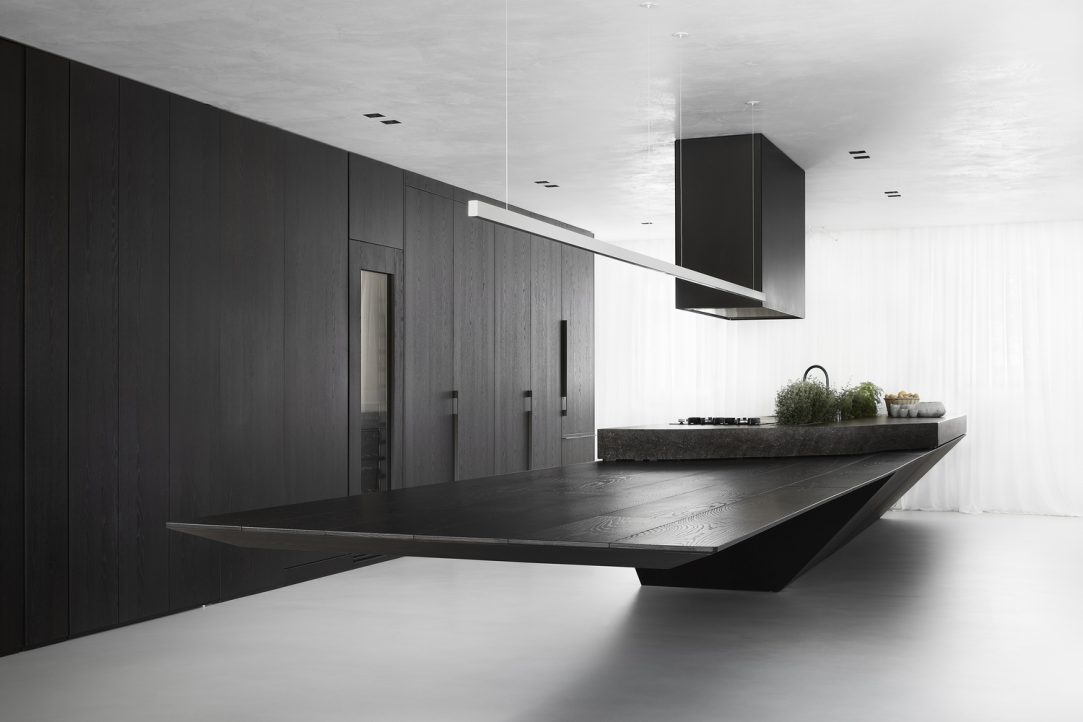 The television is no longer the focus of the living room, and the kitchen becomes not only a place where they eat but also a place where one can work, socialize and study. This concept is enhanced with a three-meter-long timber table cantilevered from the kitchen island that appears to float, becoming an integral part of the cooking area.