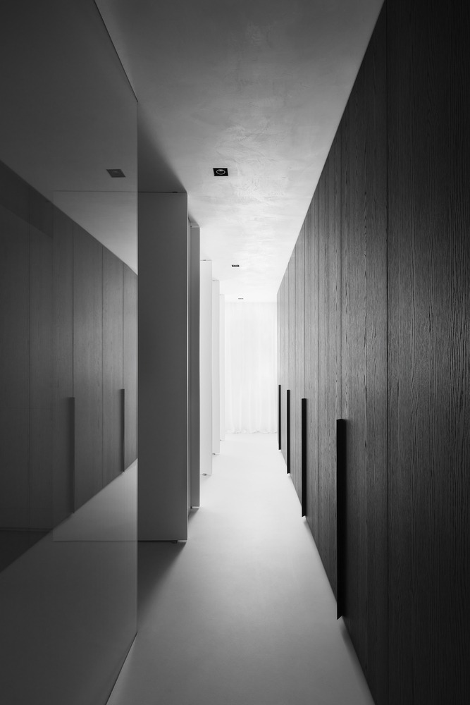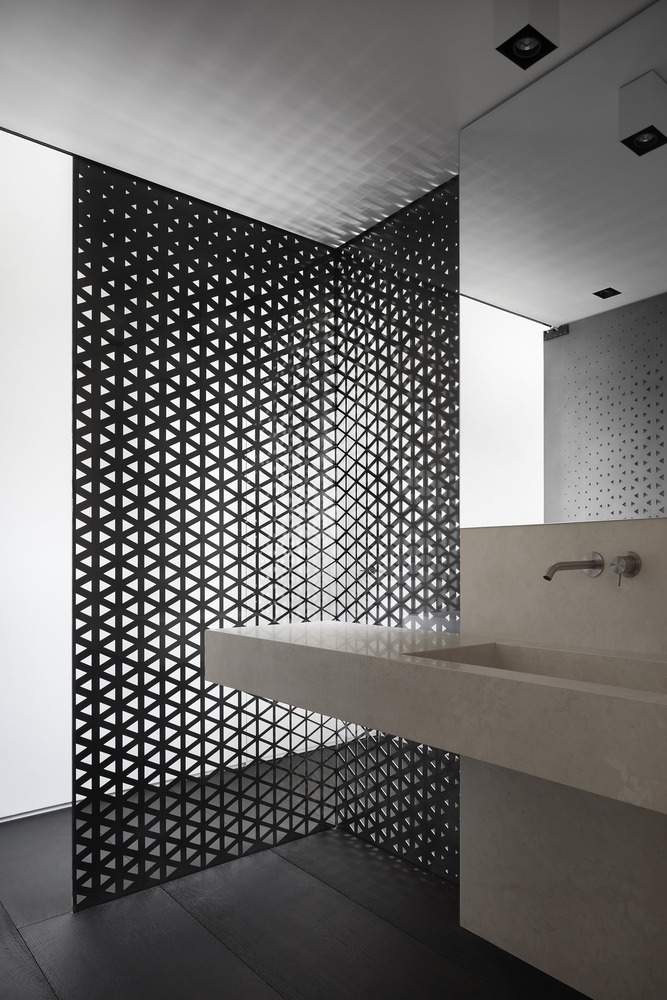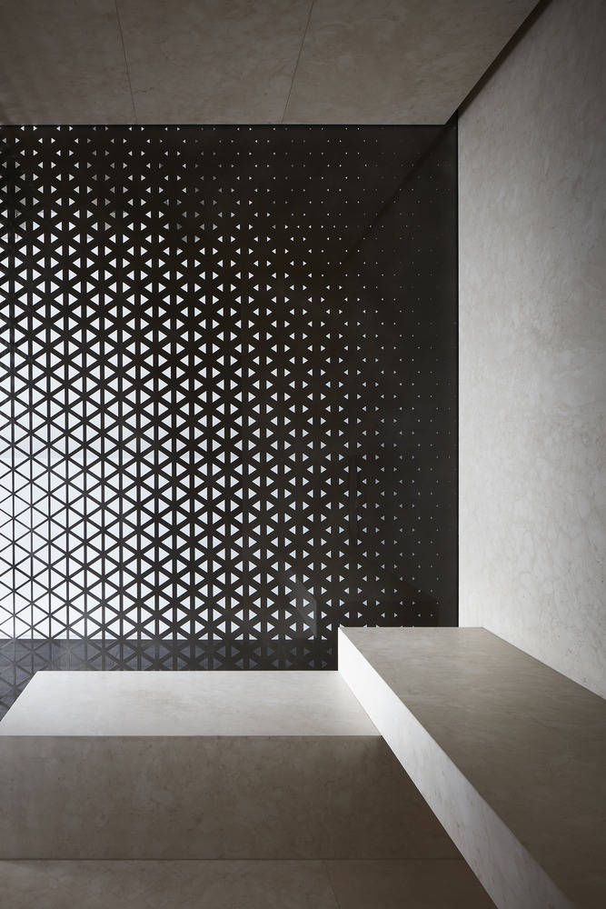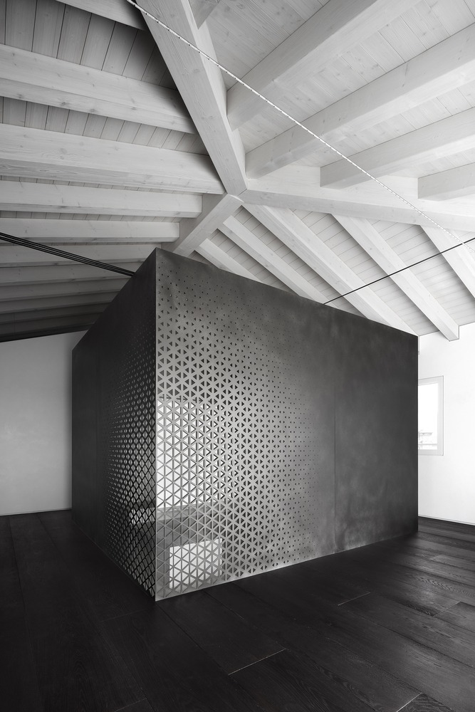 For example, the steam room area and the bathroom are encapsulated inside a metal cube. A parametric design perforation made by a CNC machine allows controlling the visual permeability between spaces and the natural lights filtrating through.