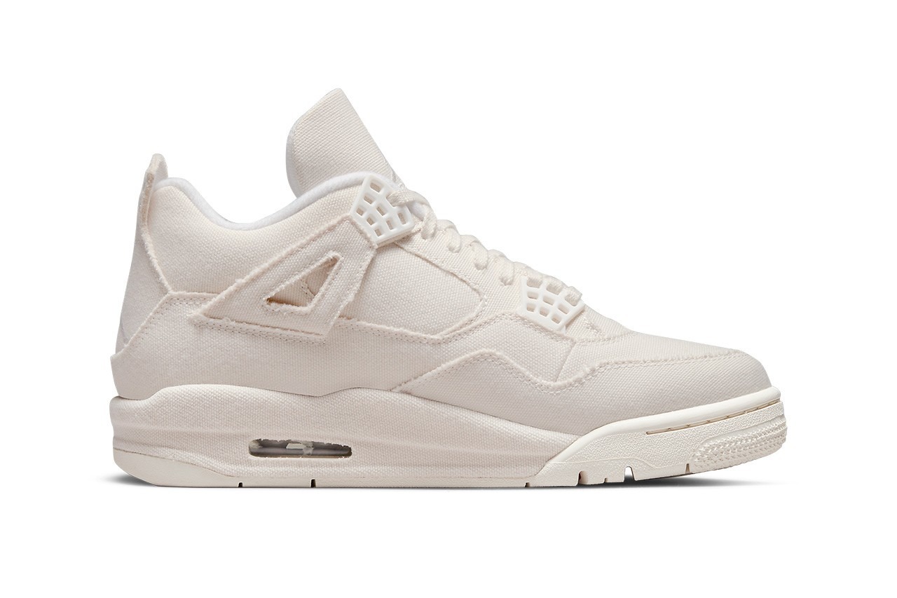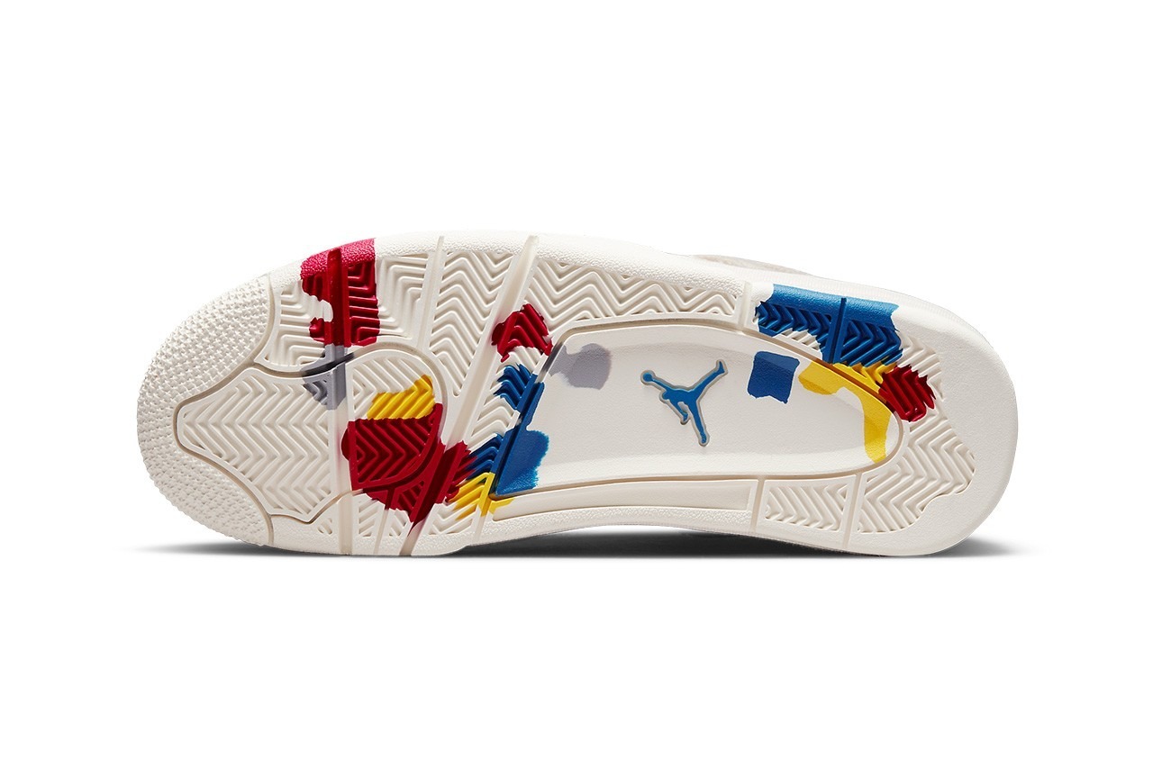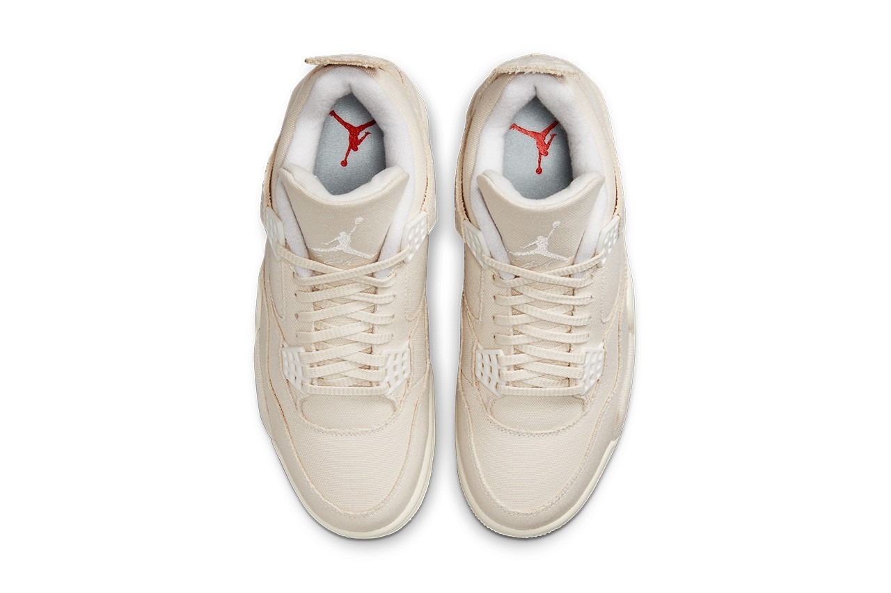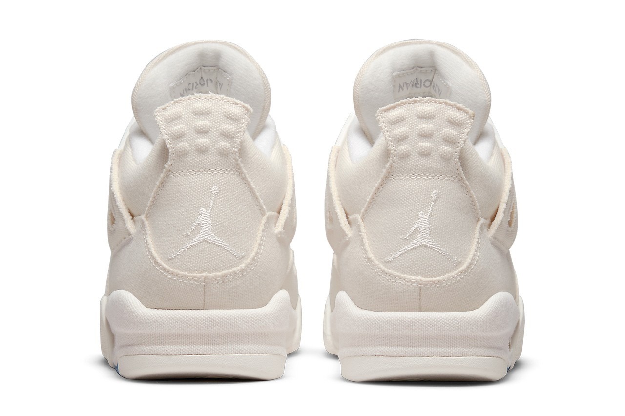 These sneakers are reminiscent of the Off-White™ x Air Jordan 4 that released in 2020. They also bear resemblance to the Aleali May’s FNF Air Jordan 4 “Veteran’s Day” collab as well. Taking quese via the full “Sail” upper from Virgil Abloh‘s take while the full canvas upper is what we’ve seen on May’s design. You’ll find small hits of creamy white on the eyelets, Jumpman logos and the interior lining which provide subtle contrasting. On the midsoles, share an off-white mold on the forefoot and a “Sail” hued section towards the rear. There’s also what looks to be fake paint blotches on the bottom of the midsole in red, blue and yellow tones.