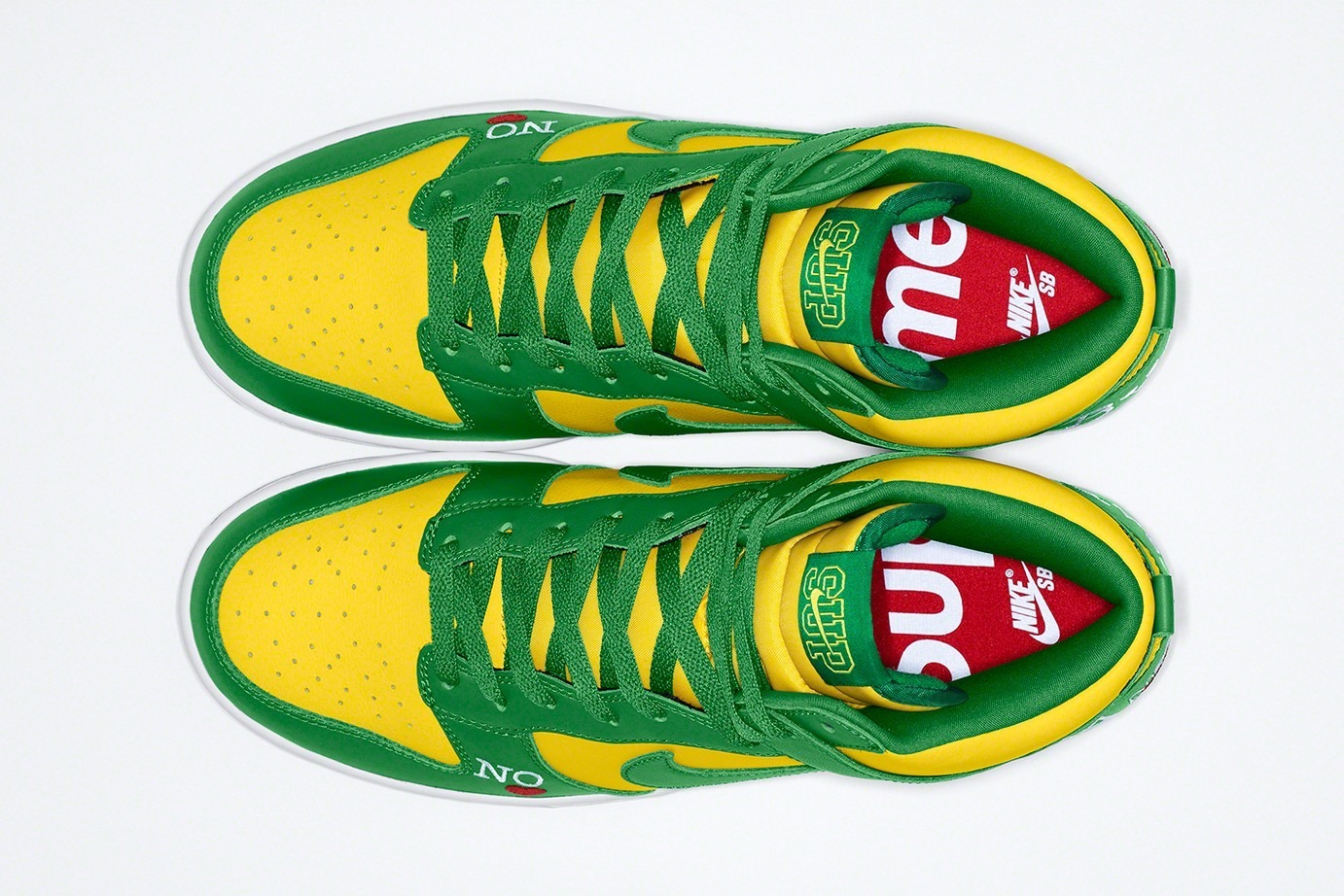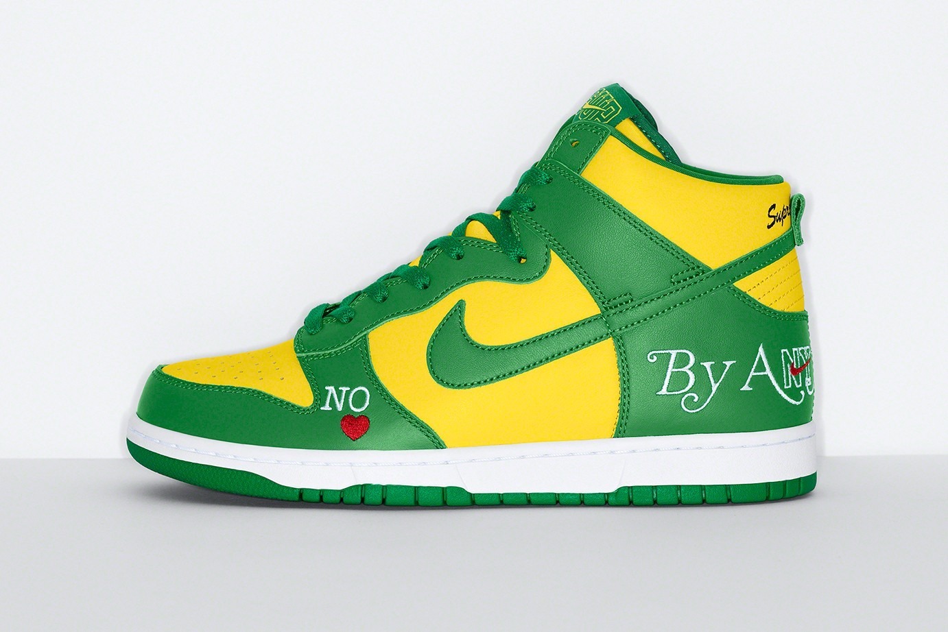 The Supreme x Nike SB Dunk High features two-tone leather uppers in a trio of colorways. Coming in “Varsity Maize/Pine Green/White,” “Navy/Red/White,” and “Black/White/Varsity Red,” the collaboration pays homage to Supreme’s “By Any Means” campaign from 2008. Additionally, each sneaker is accented by several embroidered graphics. A cross-branded “By Any Means” script graces the heel, including a custom “NY” typeface with Nike Swoosh. Just above that on the heel tab reads “Supreme Team” in a varsity-style script. Further, a subtle “NO 💗” graphic appears on the outer mudguard. Additional detailing comes across as cross-branded woven tongue tags and bright red insoles. All three iterations are complete with Zoom Air-assisted midsoles in white with contrasting colored rubber outsoles.