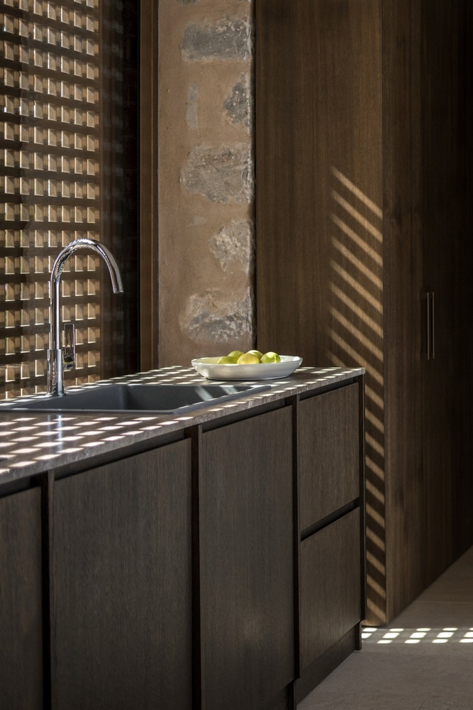 It thereby becomes possible to transfer one’s life outside the home, in this case into a courtyard divided into a set of spaces possessing different qualities and visual frames. Pergolas, secluded corners for quiet and meditation, living spaces, infinity pools blurring the boundaries of the horizon and the sky – all combine to create the external backdrop for the houses themselves. Throughout, completely natural building materials that bear the signs of time have been chosen, and that show the marks of their origin and their processing. The materials function as a blank canvas upon which the interplay of light and shadow gently unfolds throughout the day. The stone characterizes the place – Mani as it is expressed both in the ground itself and in its traditional constructions – Mani as it evokes an architectural vocabulary of ‘monolithicity’, of austerity, of strict lines and geometric volumes. Concrete complements the natural materials, creating smaller artificial stonework in earth tones and with coarse textures. Wood creates soft, warm and clean surfaces, also offering lattice shutters to complete the volumes. These materials are alternated inside and outside, intensifying the visual experience of the houses, constituting a natural but strictly conceived statement within the Messinian landscape.