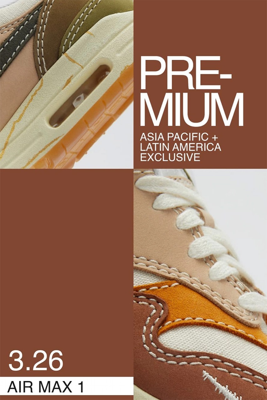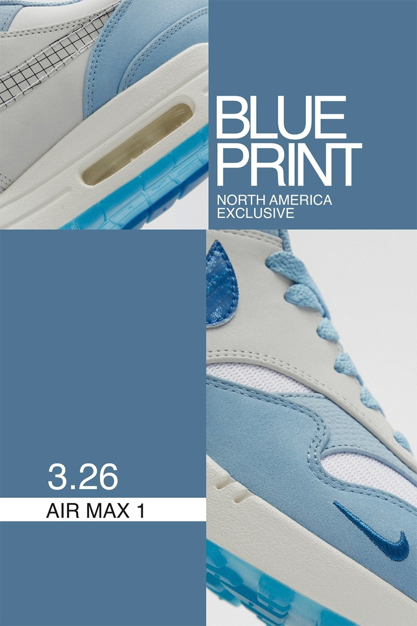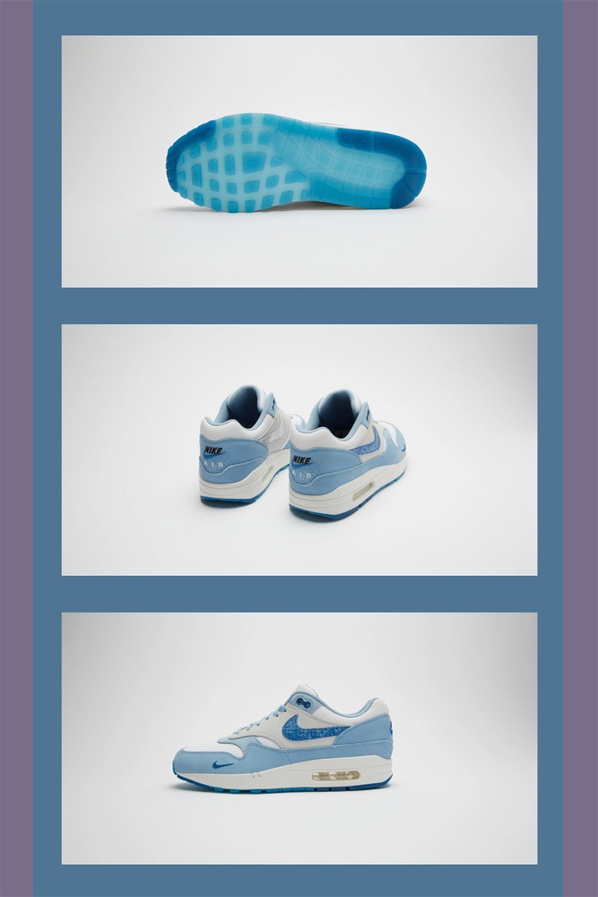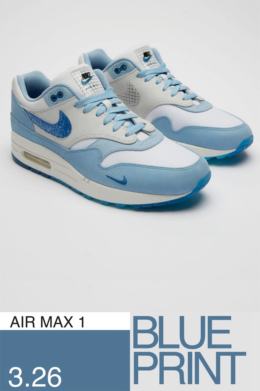 First up is the Nike Air Max 1 “Wabisabi”, where earth tones dominate the color palette. Various shades of brown complement suede mudguards and olive detailing. Exposed stitching outlines almost every panel of premium leather fabric. Further, Nike forgoes traditional heel branding in favor of a Nike smiley face fashioned into the leather. The “Wabisabi” colorway will release exclusively to Latin America and Asia-Pacific regions. Next, we’ve got the “Blueprint” colorway, exclusive to North America. This white and baby blue iteration also features a gridded pattern on the Swoosh and tongue branding.