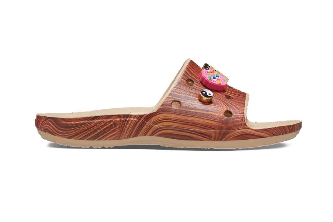 Starting off with the core design, each pair features woodgrain-inspired patterns taking shape across the base layers. For the Classic Clogs, golden bolts are displayed around the heel straps, as well as a decorative golden chain-link and friendship bracelet-inspired Jibbitz that spell out “SZA”. Additional Jibbitz that come packaged with the pairs symbolize mental health, as well as a number of SZA’s favorite things. There’s a brain piece that reads “Mental Health Matters,” as well as a water gun, asthma inhaler, mushroom, fish bait, Earth, recycling logo, butterfly, and more.