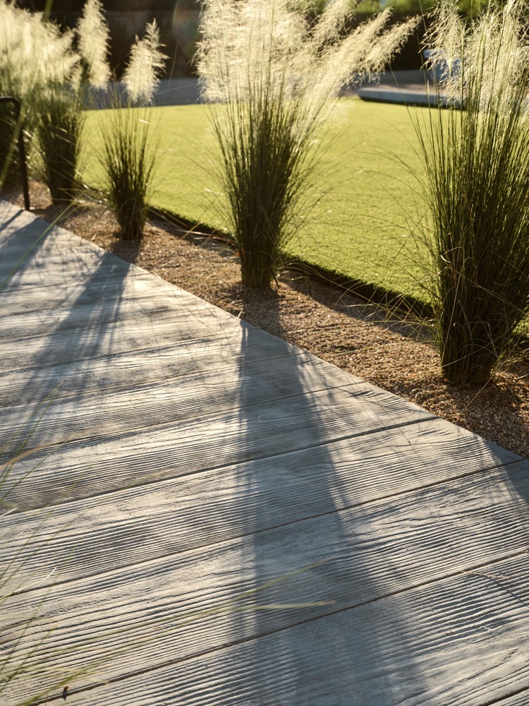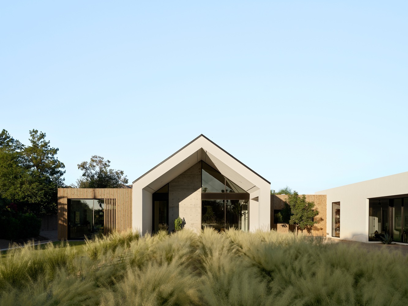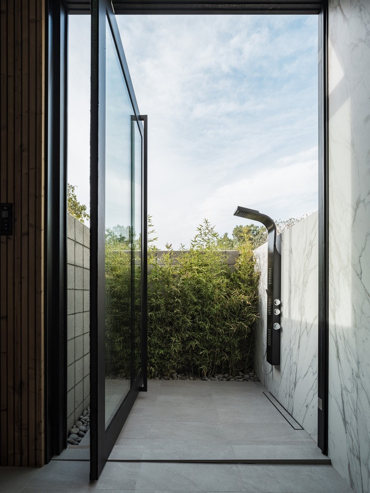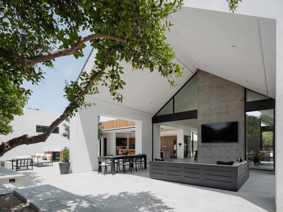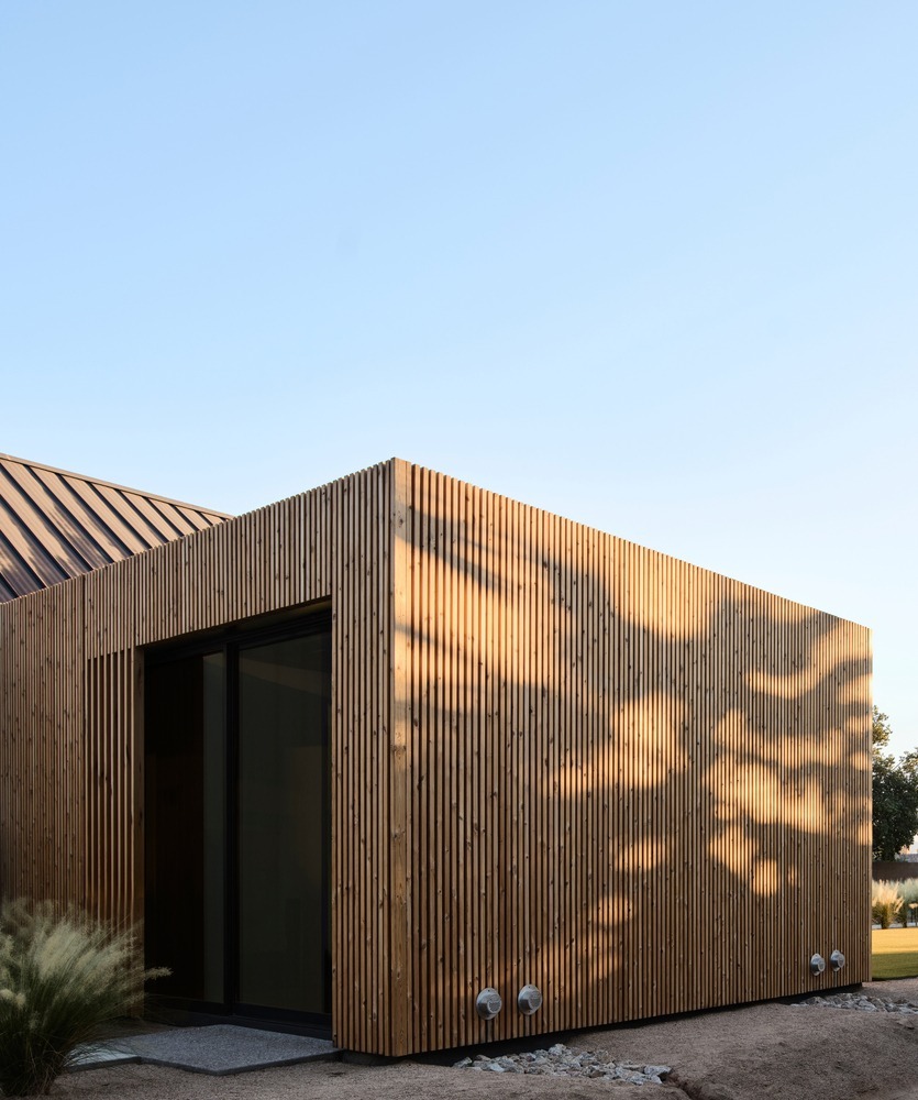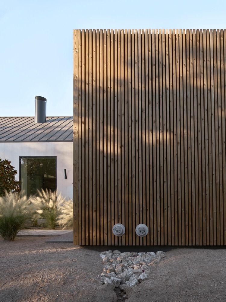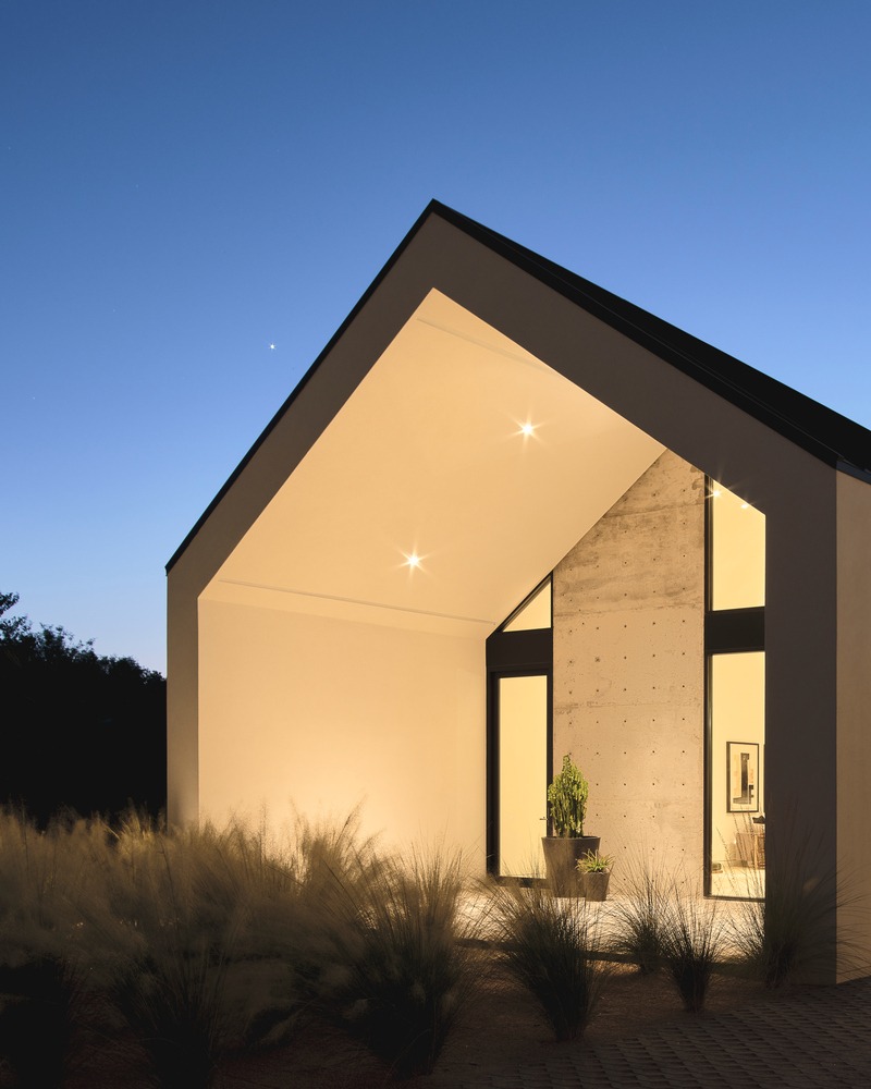 The Ranch Mine used this unique shape and privacy to create a home that extends out into the landscape, stretching out to guide friends and family into the embrace of the courtyard-style plan. While traditional ranch homes had low pitches roofs, ‘Hive’ features a gabled volume to signify the entrance and main living area, flanked by flat roofs to maintain the low, linear profile and meet the strict zoning height restriction of the area.