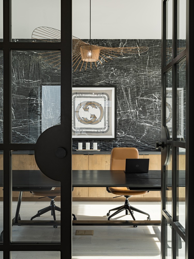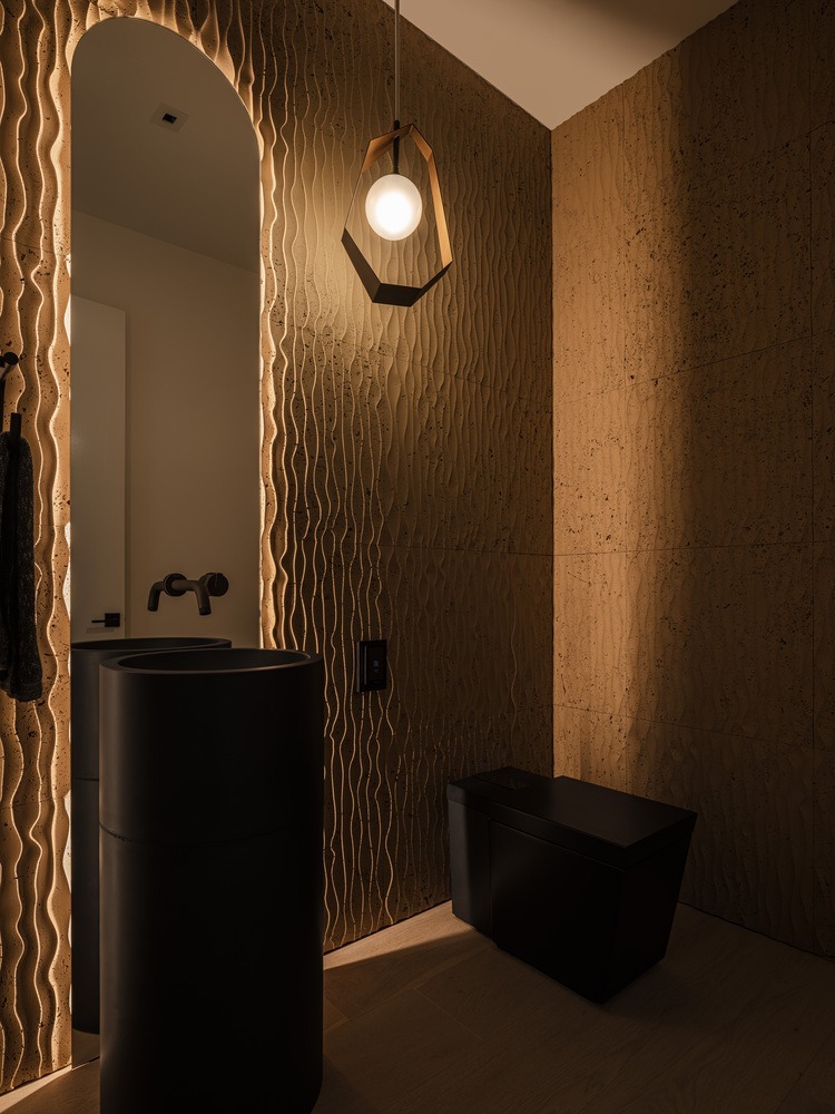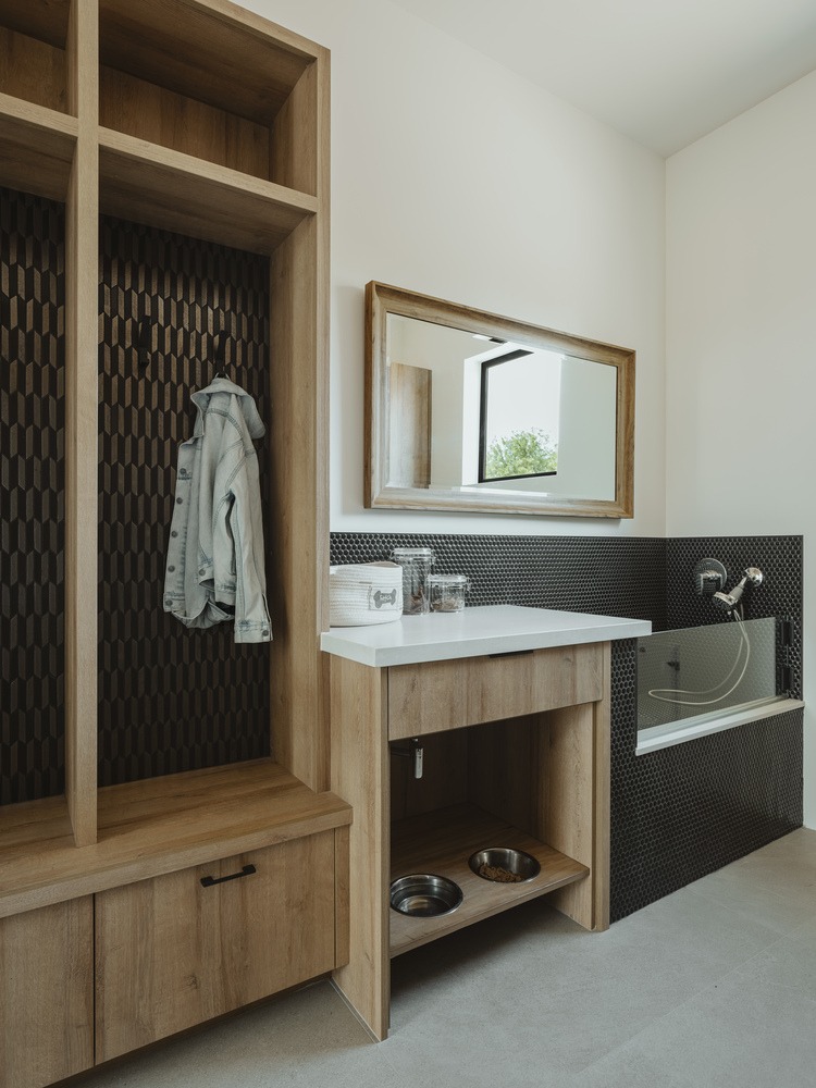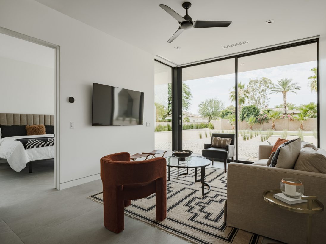 The bedroom wing is separated from the living areas of the house and features a den, a homework area, and a mudroom with a dog wash. Taking the traditional ranch move of separating the bedrooms a bit further, The Ranch Mine used the garage to separate the main house from the attached guest house, which can be accessed through the garage or directly from the exterior. The guest house is used by the clients’ parents seeking sun during the winter and by guests year-round.