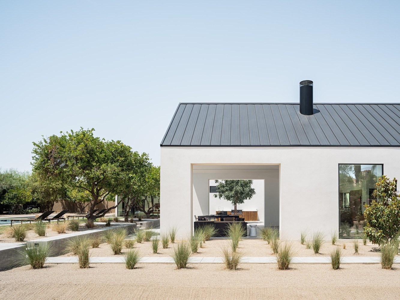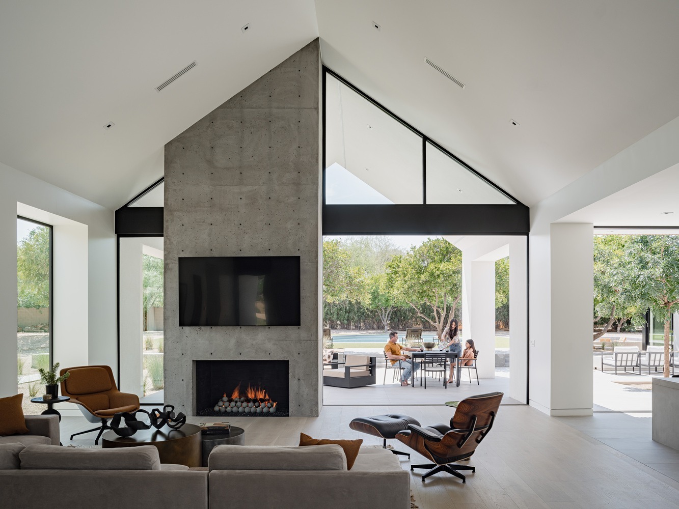 Stepping into the gabled living area, friends and family are welcomed to views through the house past the poured in place concrete fireplace through pocketing glass doors to a covered patio, pool, hot tub, and sunken fire pit beyond. On one side of the living area is a home office and on the other side is the kitchen, both of which are cross-ventilated with ample natural daylight.