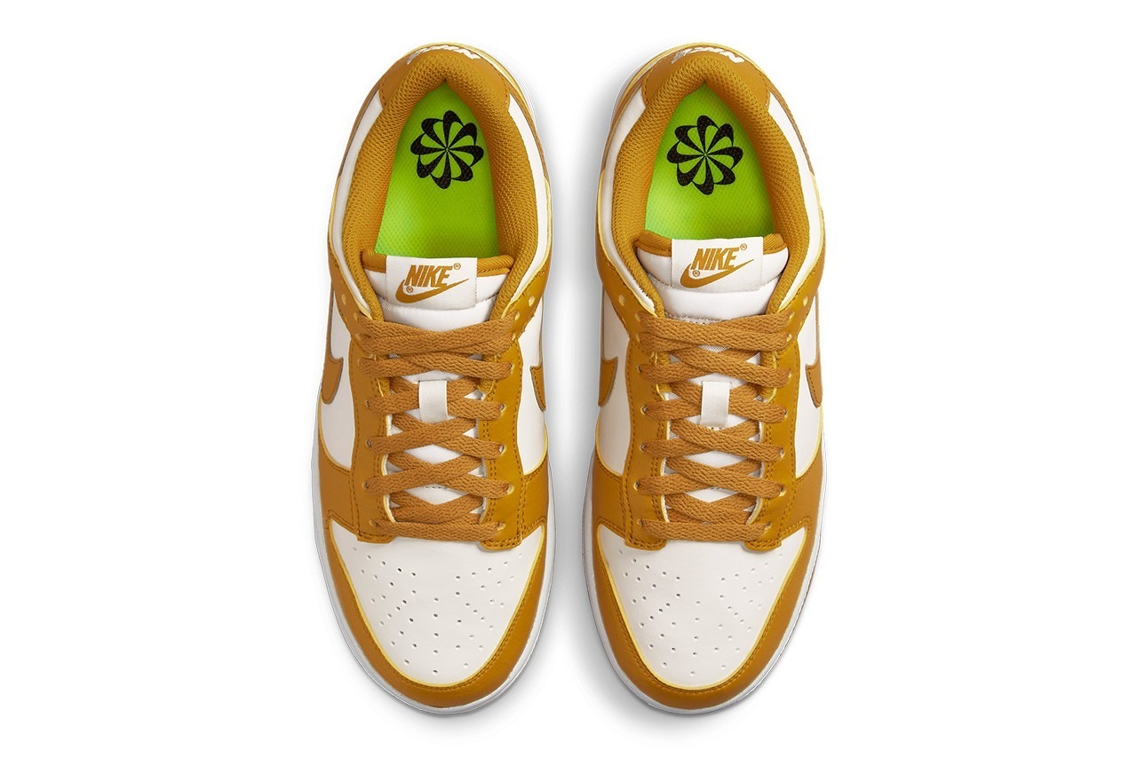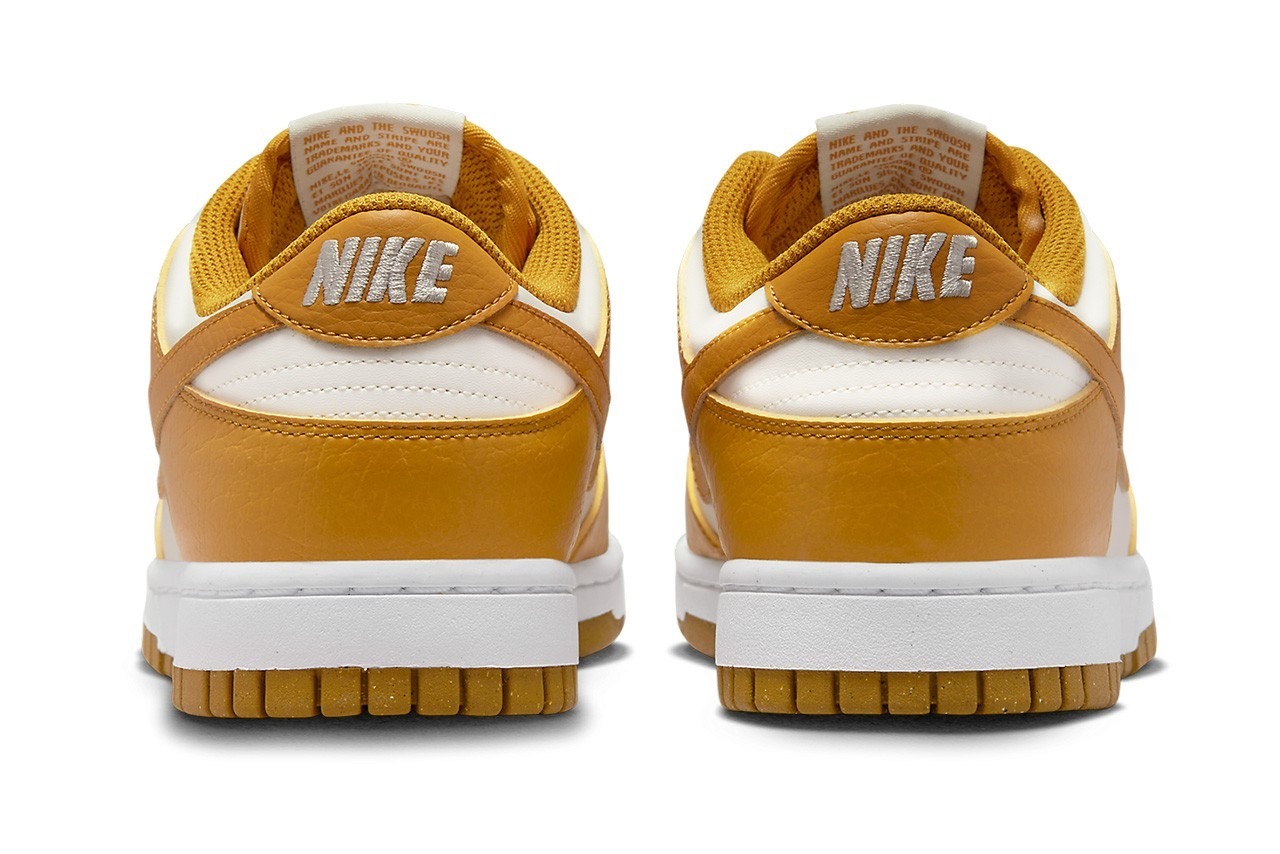 For this two-tone Dunk, Nike uses a Summer-ready golden hue over smooth panels of white. Leather overlays arrive with a crinkled aesthetic as seen on the model’s previous colorways. However, the toe boxes, quarters, and collars use Nike’s standard patent leather. The luxurious gold interior lining on the inside meets volt-colored insoles stamped with the Swoosh’s retro pinwheel logo. This all rests atop a white midsole and gold speckled outsole, indicating Nike creates the sneaker sustainably.