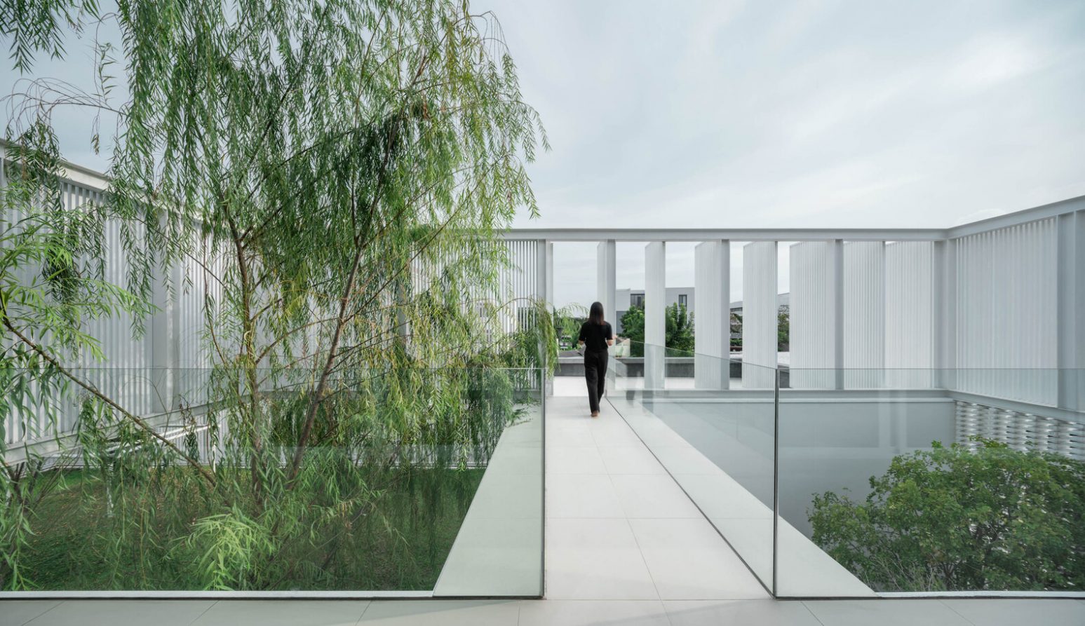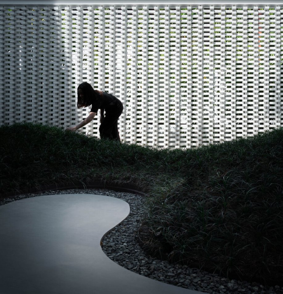Greenspaces are subdivided into courts, enclosed in facades and screens of varying degrees of pellucidity. Like individual cloths, tailored to specific requirements, veiled over internal spaces, these specially laid walls and facades define exterior spaces where courts become “green rooms” interconnected with the interior volumes. Often the spatial sequence is layered with foreground trees and background shrubbery, one court backed by another. Each court is designed with its own unique characteristic, grouped into five segments, responding to differing intended uses.