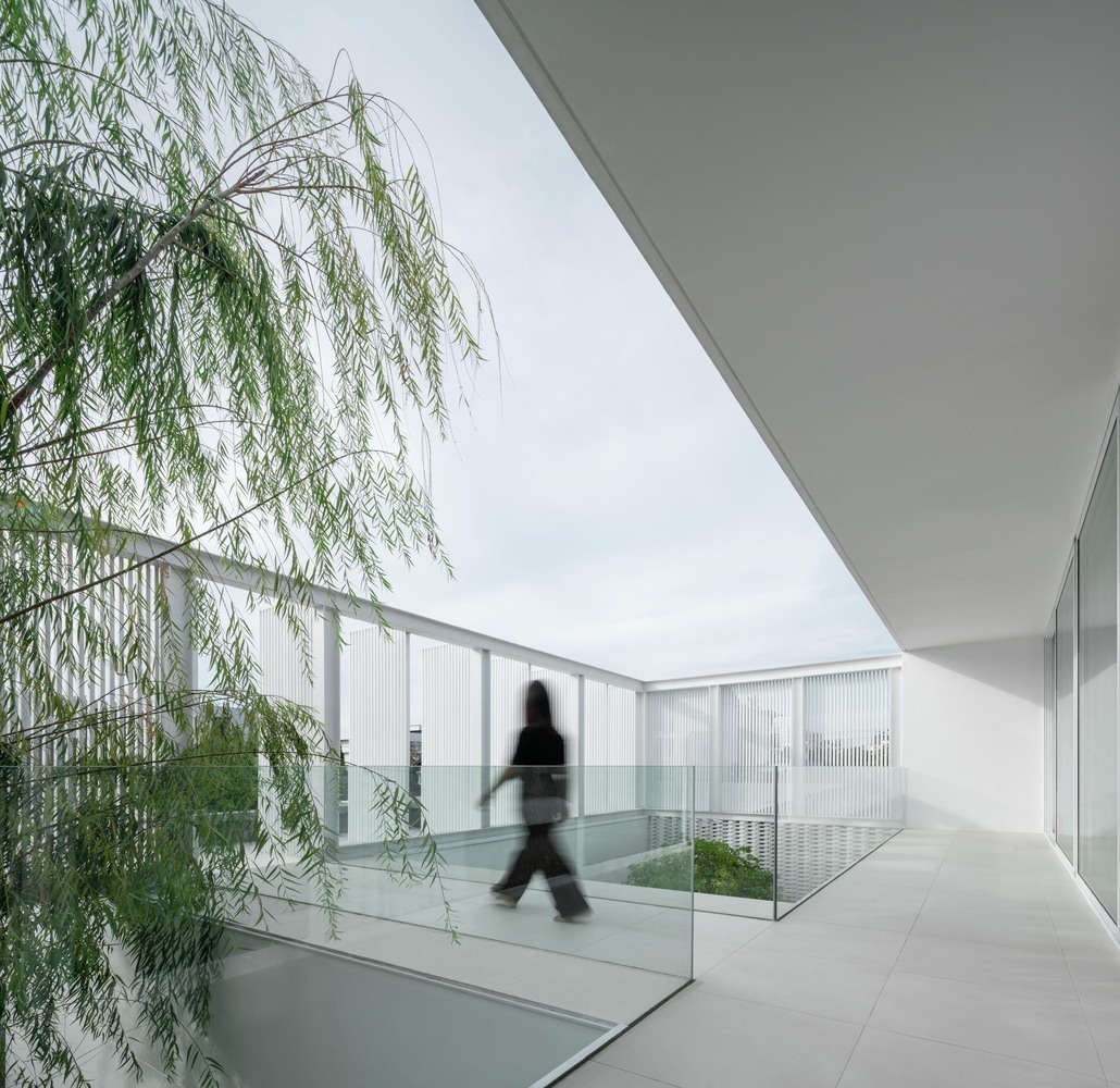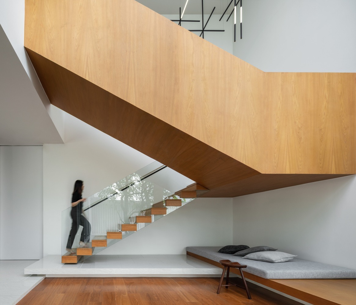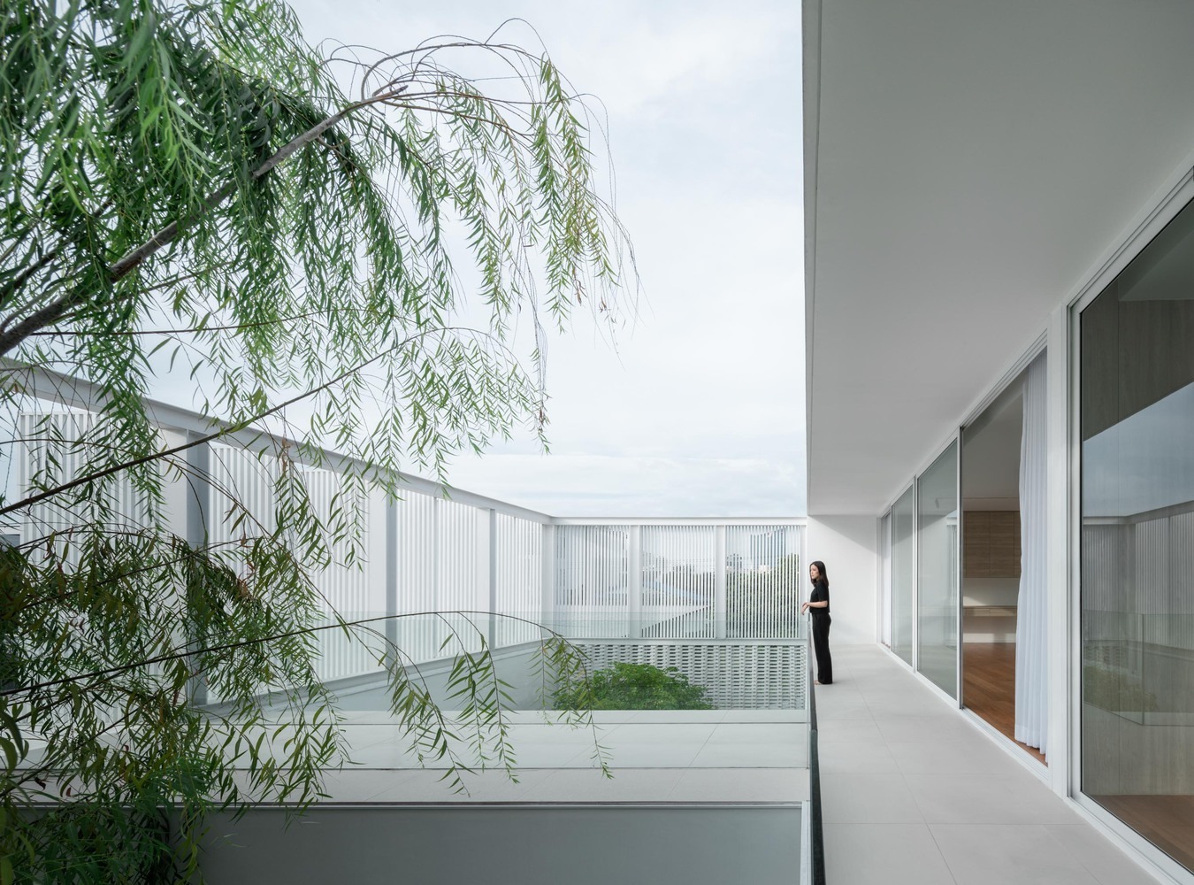 The staircase transitioning from the more public space to host guests to the private space for the family has its privacy level reflected in the; glass balustrade of the first flight and transitions into solid timber walls in the second as it reaches the private upstairs. At the top of the stairs, the snug has its own green room directly behind. The screen allows the foliage of the tree below to be framed and contained. The final layer of the house is the most private Sky Garden; only available to the owner, other members of the family do not have access. The view from the master bedroom is complexly layered resulting in a refined simplified view of lush greenery. In the foreground lies a bridge leading to a lowered terrace. On either side are swaying leaves originating from the downstairs court shared with the study as well as the Weeping Willow forming the midground. Through the screen, the central court trees are visible in the distance. This view is permanent, unwavering, and uncompromising, as the screens ensure complete privacy, no blinds required.