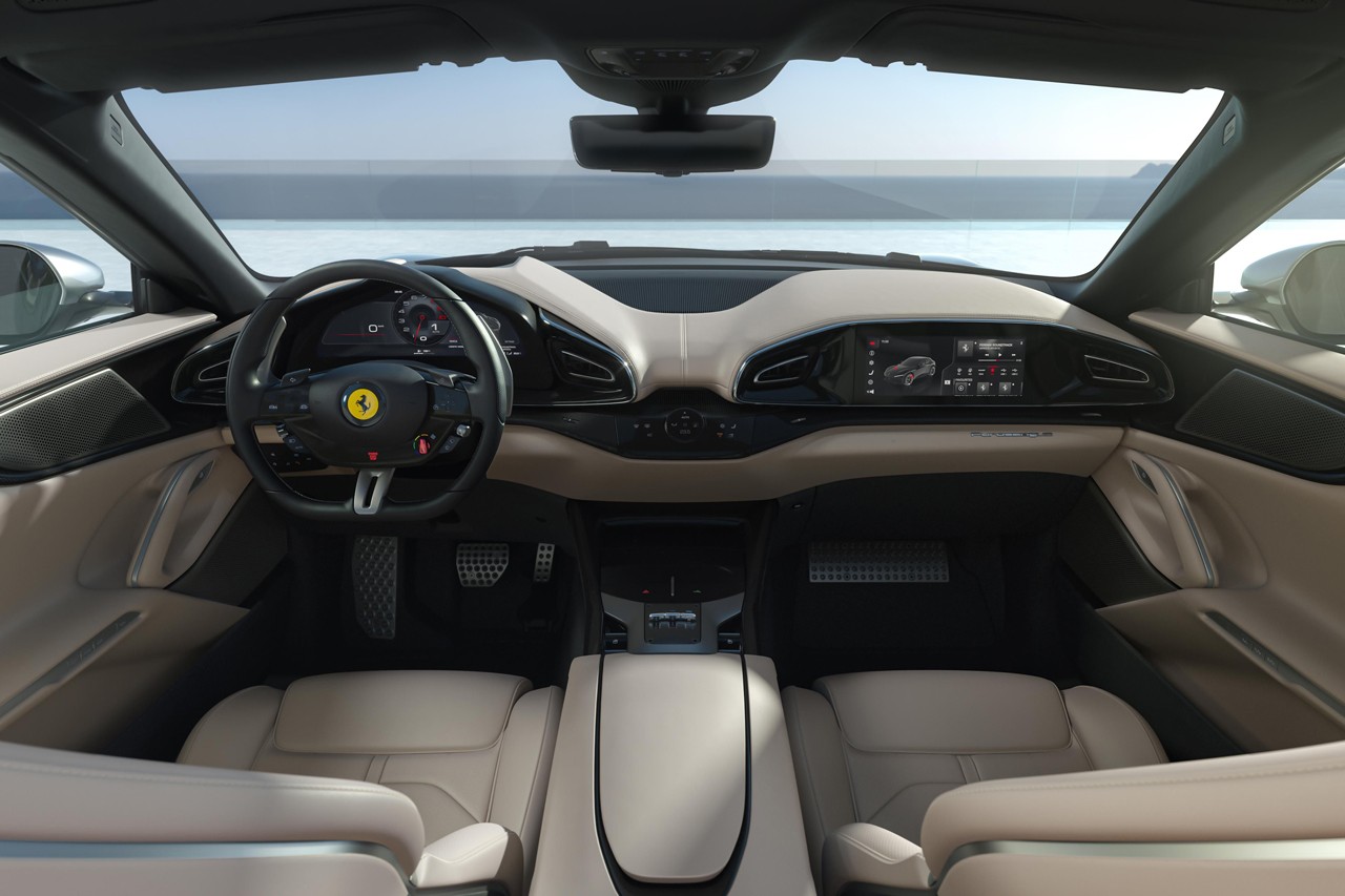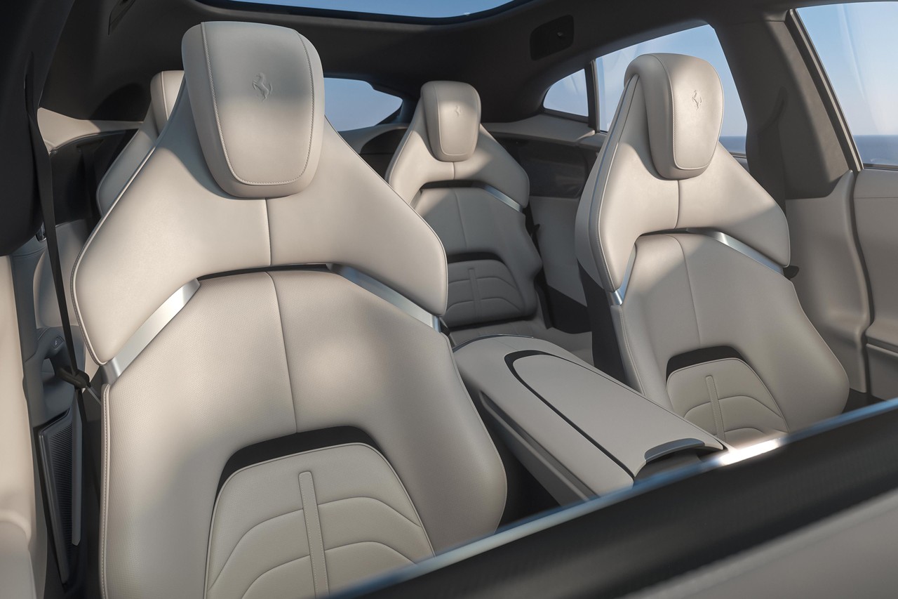 Inside the vehicle, a passenger screen “provides all the information required to help them participate in the driving experience.” To ensure all travelers remain in utmost comfort, the Purosangue features four full-sized and fully adjustable seats for the first time in any Ferrari model. While both front and back seats are warming, the front seats also have a massage function. Despite the Purosangue’s unconventional height for a Ferrari, the seats are close to the floor to maintain the brand’s traditional low-slung driving experience. Additional interior aesthetic details include a glass cupholder and an optional full-length glass roof.