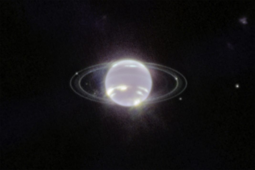 Some of Neptune’s rings had not been detected since NASA’s Voyager 2 observed Neptune during its flyby in 1989. While Neptune typically appears blue due to atmospheric methane, Webb’s infrared camera shows the planet in a whiter hue. The beautiful lines of light appearing on the planet’s surface are high-altitude methane-ice clouds reflecting sunlight.
