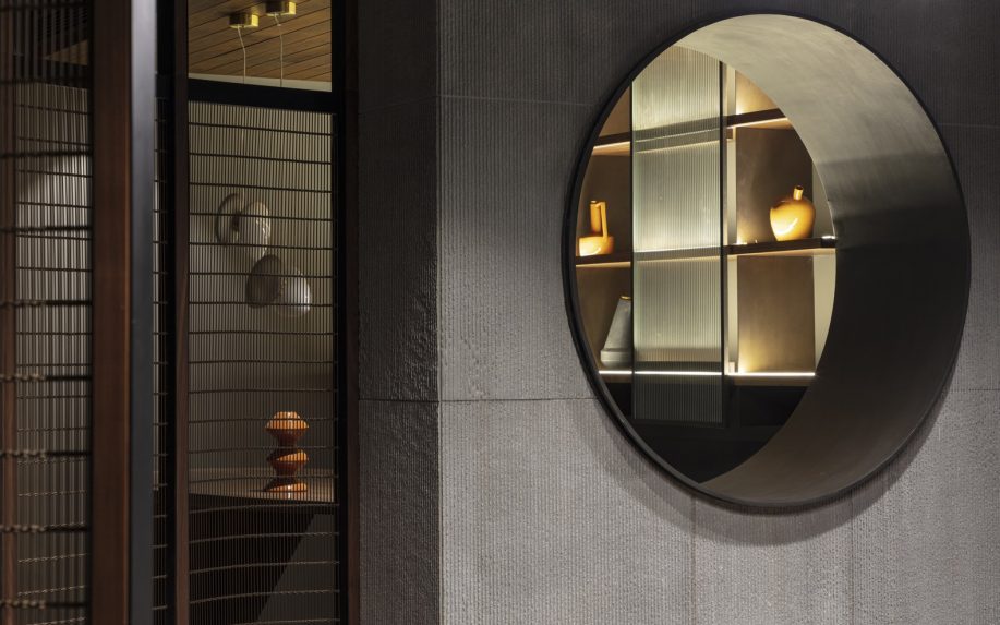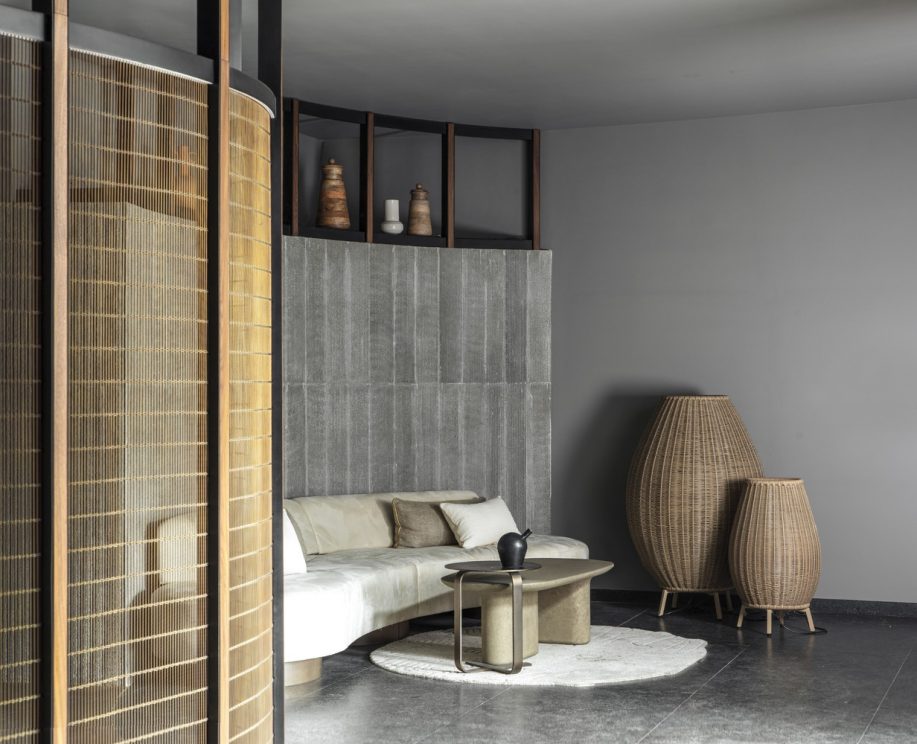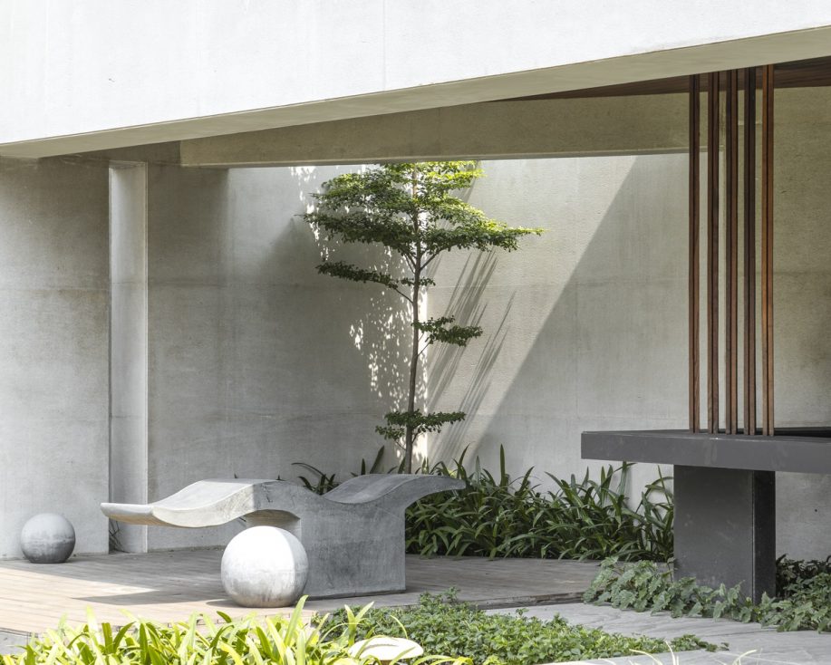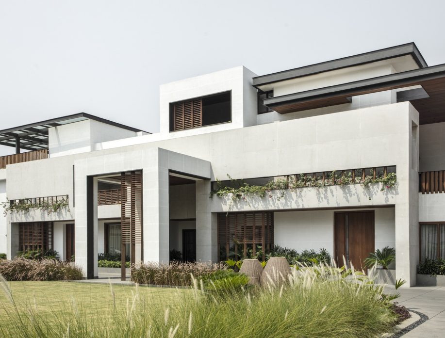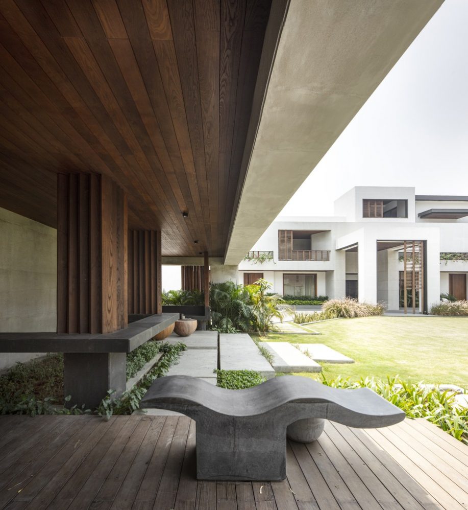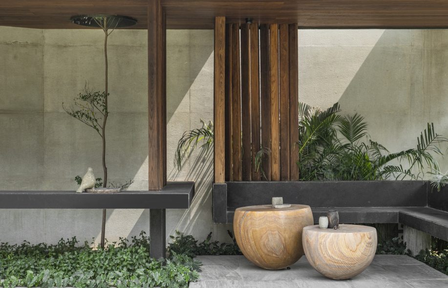 Throughout the property, wooden louver details are carefully designed to embody lightlessness and warmth, creating this sense of organized asymmetry. Outside, chiseled furnishings appear in several recreational sit-out areas in the landscaping. Made from natural Thermo-Ash wood and soft limestone, these spaces provide a functional yet calming retreat. This updated structure takes on revived meaning as it soulfully reshapes the way the structures and surfaces of the residence cohabitate.
