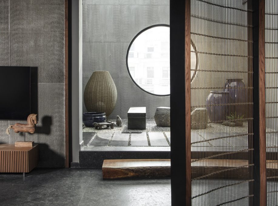 Featuring wooden louver details and stone outdoor furnishings.