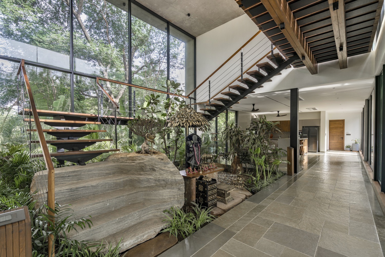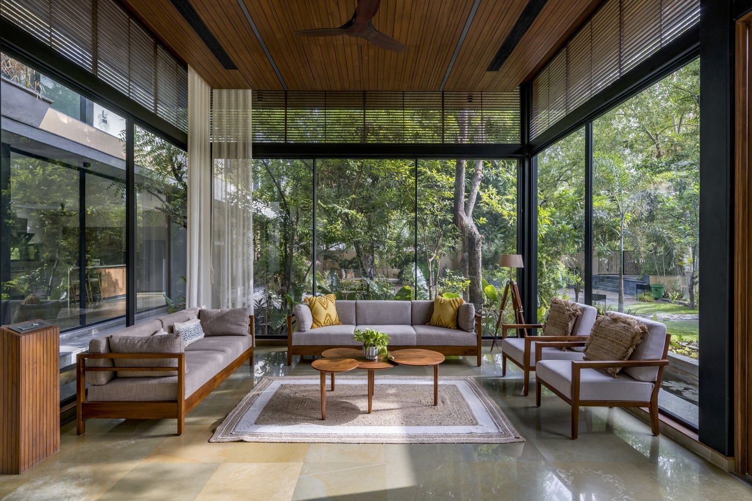 The intent behind VPA Architects’ design of the Kalrav Villa is the least possible footprint taken up by the house. Throughout the villa, glass windows and balconies facilitate maximum interaction between the house and its invigorating green landscape. The low heightened entrance pavilion welcomes guests into the house before it unfolds into two elevated seating rooms. Water bodies encompass the private and formal rooms, creating an ambiance of a floating island. Further, the islands reveal a central, double-height stair shaft enveloping the landscape and blurring the lines of inside-outside.