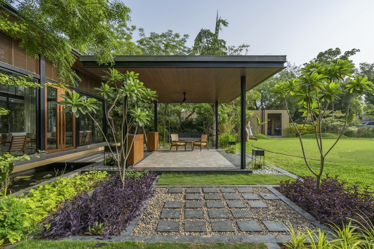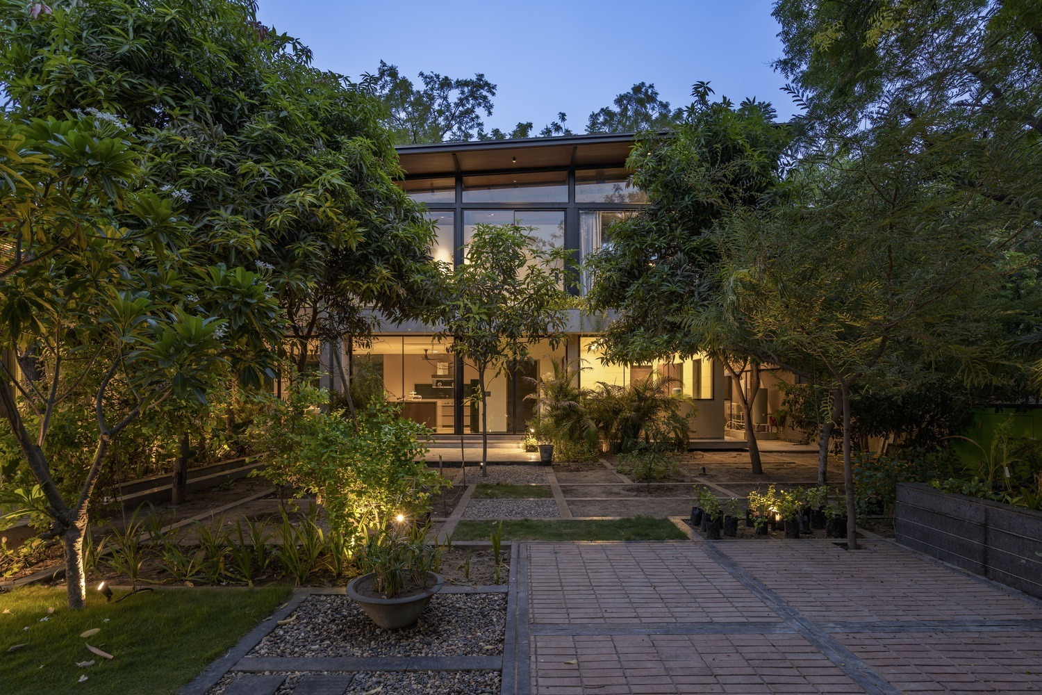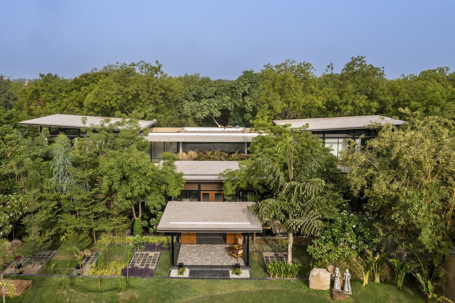 Nestled within a thicket of sapped trees lies the Kalrav Villa, an abode to humans and birds alike. Facing the east, a glass façade shapes the house’s design as it opens up in the form reminiscent of a flying bird. Exposed concrete and lime plaster support the façade, flaunting a minimal, sleek, and earthy design.