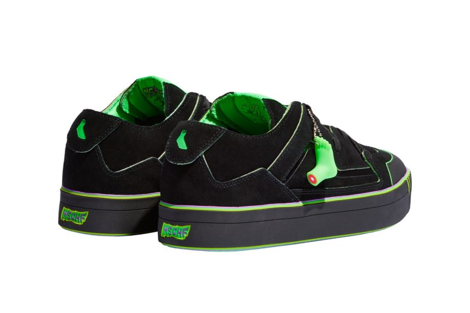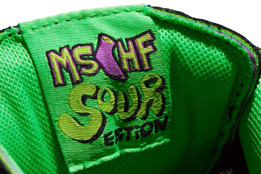 Once again drawing inspiration from the Gobstopper candy, the Gobstomper features several green and purple layers. The “Sour Edition” begins as a primarily black sneaker with neon green accents throughout. As the layers wear away with time, the acidic green and purple hues take over. MSCHF brings back the triple exclamation point logo on the tongue tags, as well as the foot logo on the heel tab. Under neath, soles are decorated with a psychedelic pattern emanating from the signature foot logo.