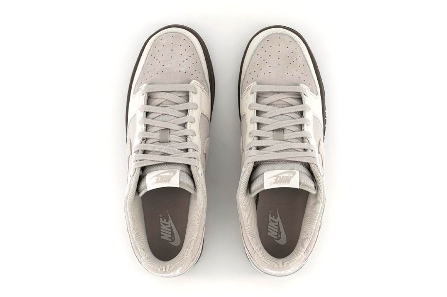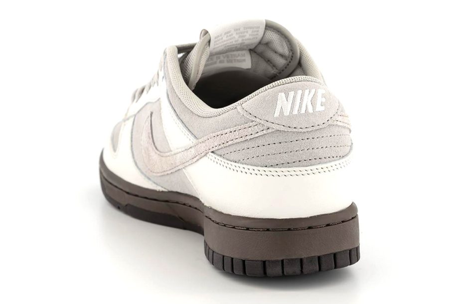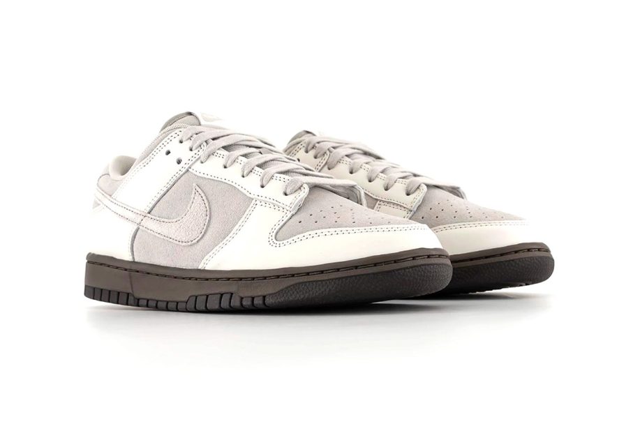 Nike uses a trio of materials and colors to create the “Ironstone” Dunk Low. Foremost, the upper displays a phantom, light iron ore, and ironstone color scheme. Suede covers the base layer, including the toe box, quarters, collars, and heel tabs, as well as the Swoosh. Meanwhile, Nike’s patent leather appears in white on the overlays. Tongues and interior lining opt for a mesh material, while traditional Nike branding hits the tongue tags and insoles. Finally, a two-tone rubber outsole in dark brown completes the subdued offering.