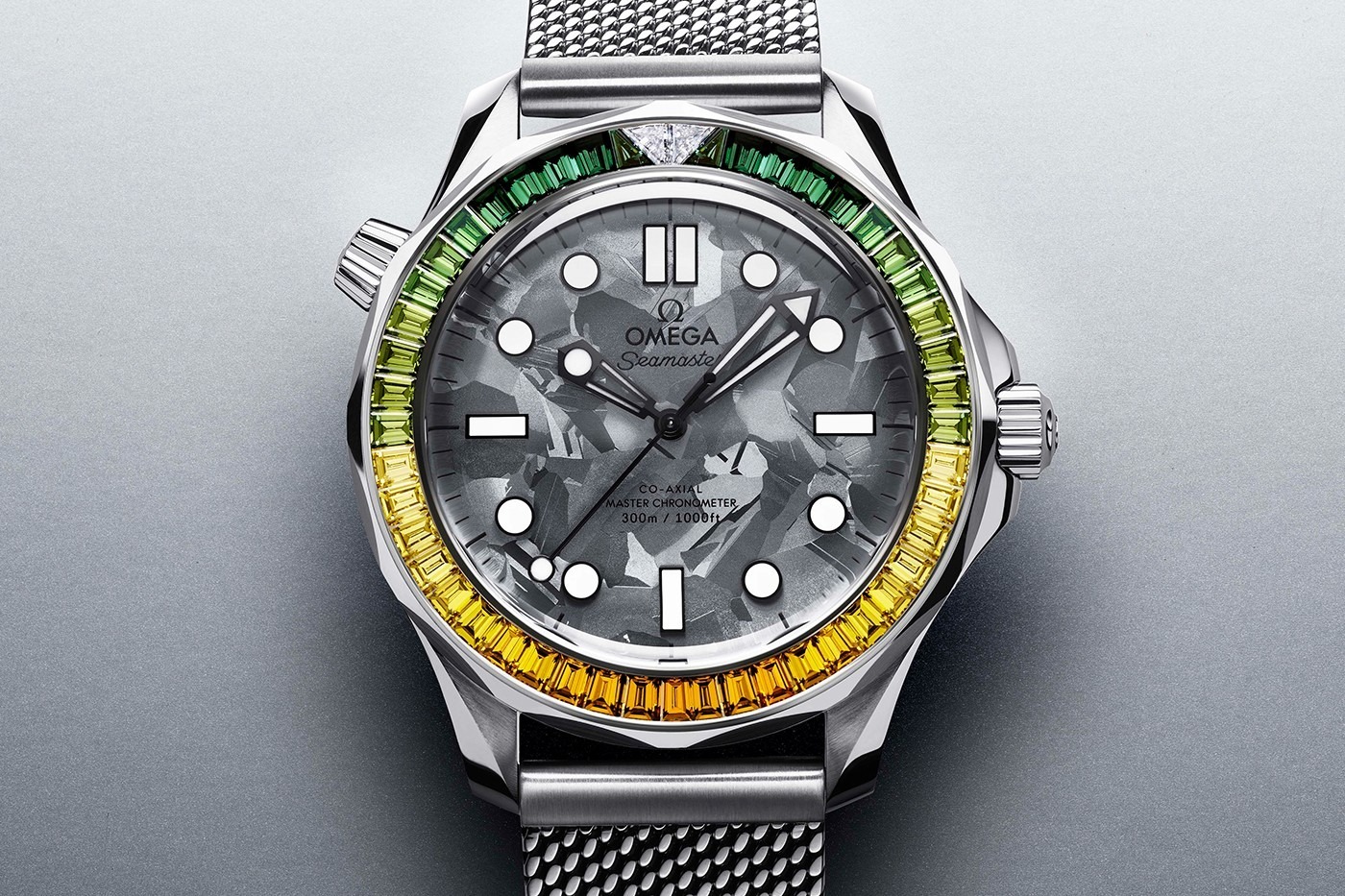 The Stainless Steel variant finds drive by way of a precise Co-Axial Master Chronometer Calibre 8806. It features blue oxalic anodized aluminum bezels and dials, as well as a mesh-style band reminiscent of 007’s watch from No Time To Die. Meanwhile, the Canopus GoldTM version, powered by the exquisite Co-Axial Master Chronometer Calibre 8807. It’s made with OMEGA’s own 18k Canopus GoldTM and features a crystallites-embedded dial that pays homage to the Jamaican flag.