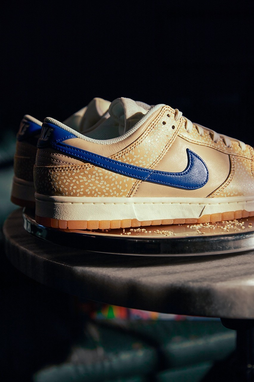 Nike leans into the titular motif to pay homage to the Canadian city’s signature sesame seed bagels with toasty overlays styled with sesame-inspired patterns. “Royal Blue” accents adorn the Swooshes and heel tabs as an homage to the flag of Quebec. Further, insoles feature wood prints to symbolize wood-burning ovens. Laces, tongue labels, and interior lining arrive in white to represent one of a bagel’s best friends: cream cheese. Finally, white midsoles meet translucent gum outsoles to salute the honey-water dip that elevates Montreal-style bagels with a distinct hit of sweetness.