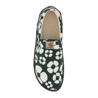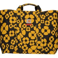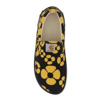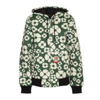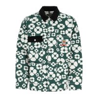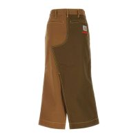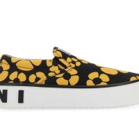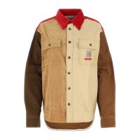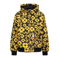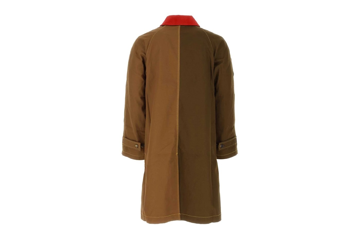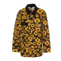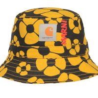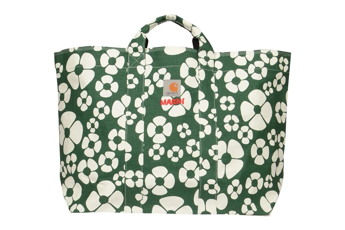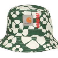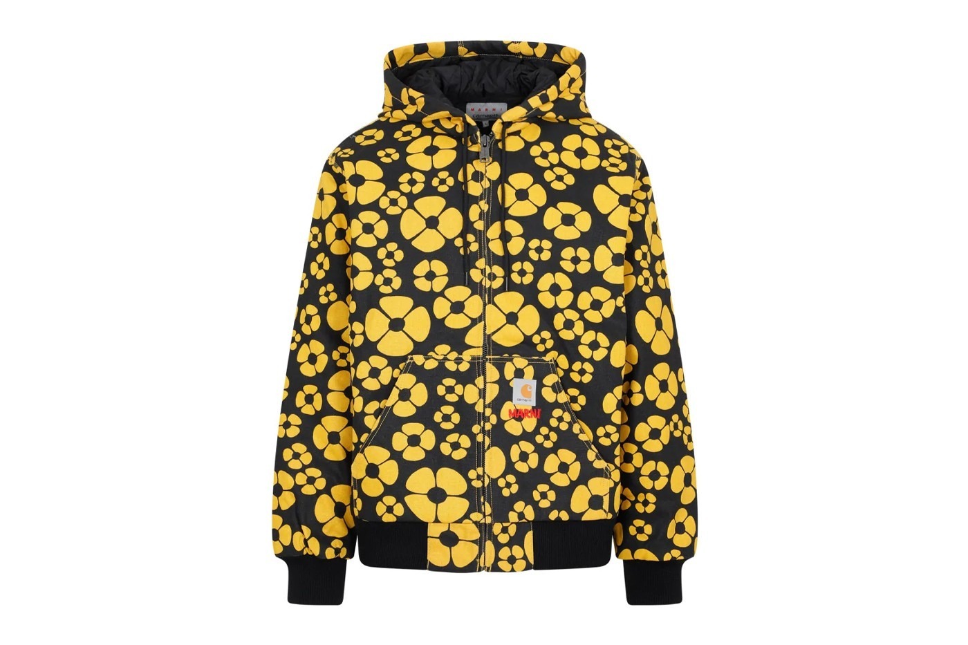 The upcoming series includes a range of modified workwear staples and accessories dressed in yellow and green floral block prints. Marni’s playful use of color takes over flap-pocket shirts, flared pants, heavy zip-up hoodies, and asymmetric skirt pants. Further, tote bags, bucket hats, and platform slip-ons feature Carhartt patches paired with Marni logo stitching. The collection also features tunics and work shirts dressed in a rustic mix of canvas and corduroy fabrics finished with bright red collars. Finally, bourbon leather jackets and knitted orange-and-black logo print sweaters complete the forward-thinking collection.