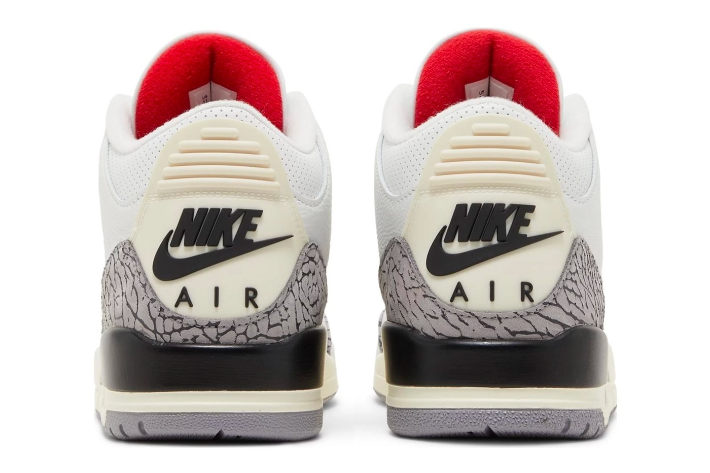The Air Jordan 3 “White Cement Reimagined” will feature the famous color combination of “Summit White/Fire Red/Cement Grey”. As well as a design inspired by the original 1988 release. The uppers, comprised of fine white leather with perforated portions and Elephant print overlays on the toe and heel. Additional details include red Jumpman designs on the tongues, white laces, and red insoles printed with contrasting text in black. Yellowed eyelets, “NIKE AIR” heel counters, and midsoles with gray rubber outsoles round out the shoe’s look.