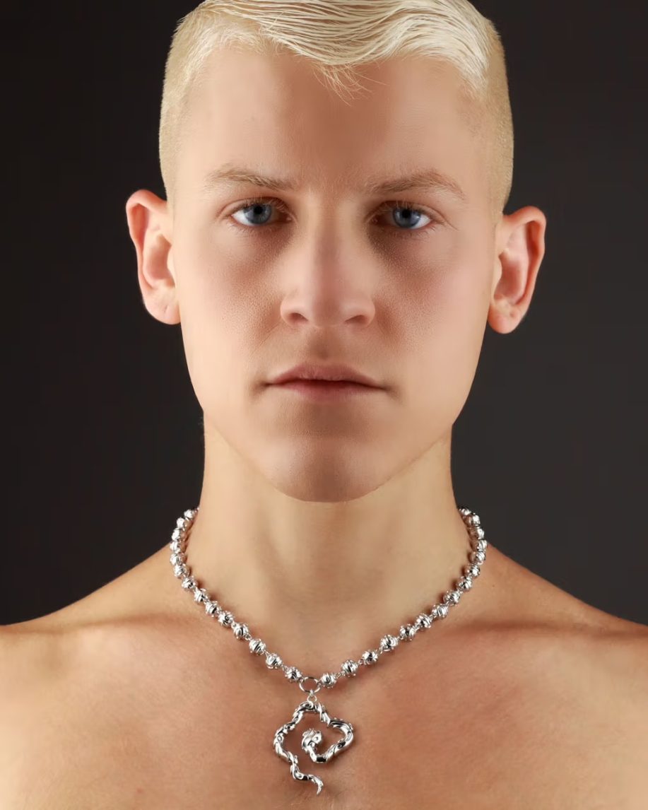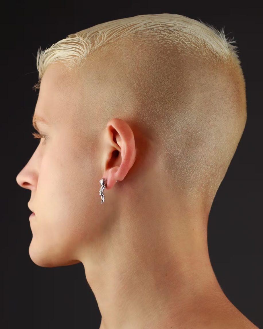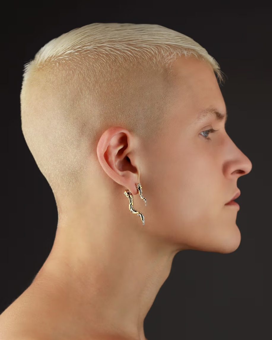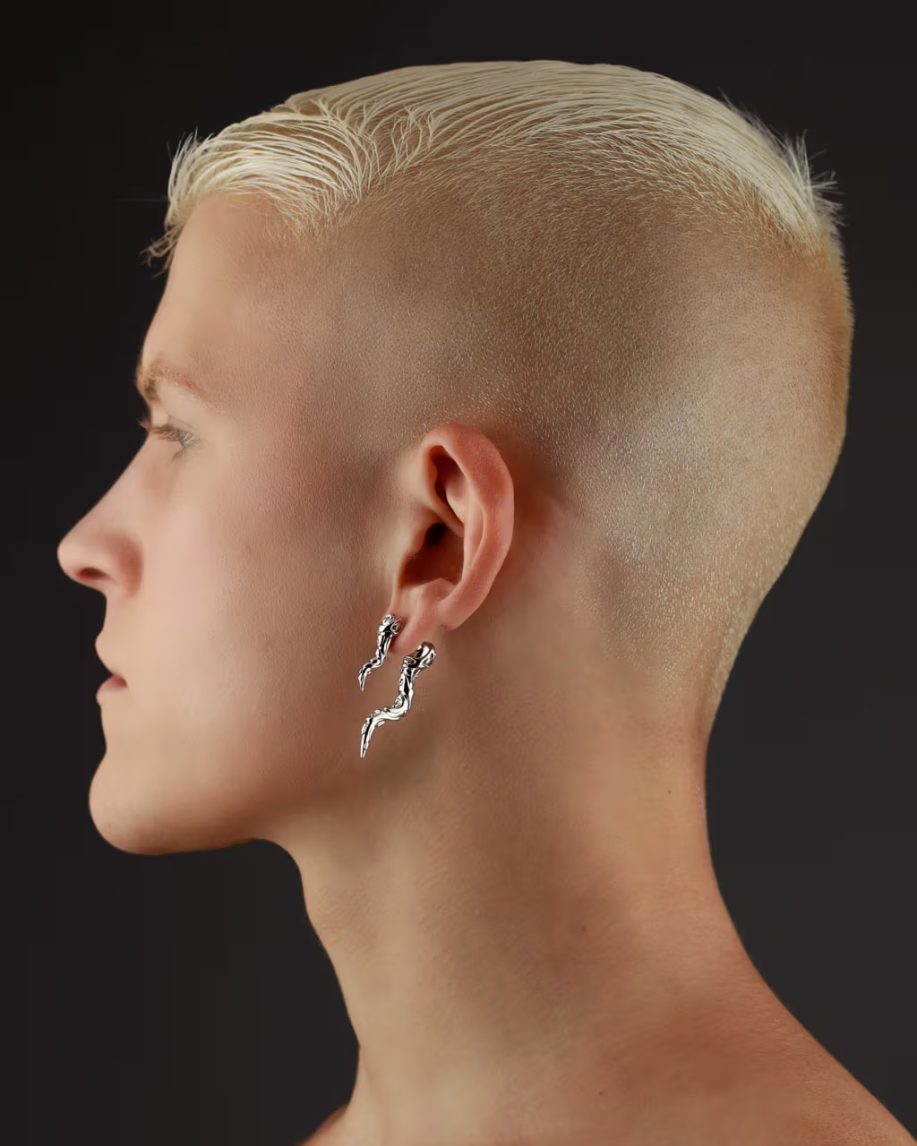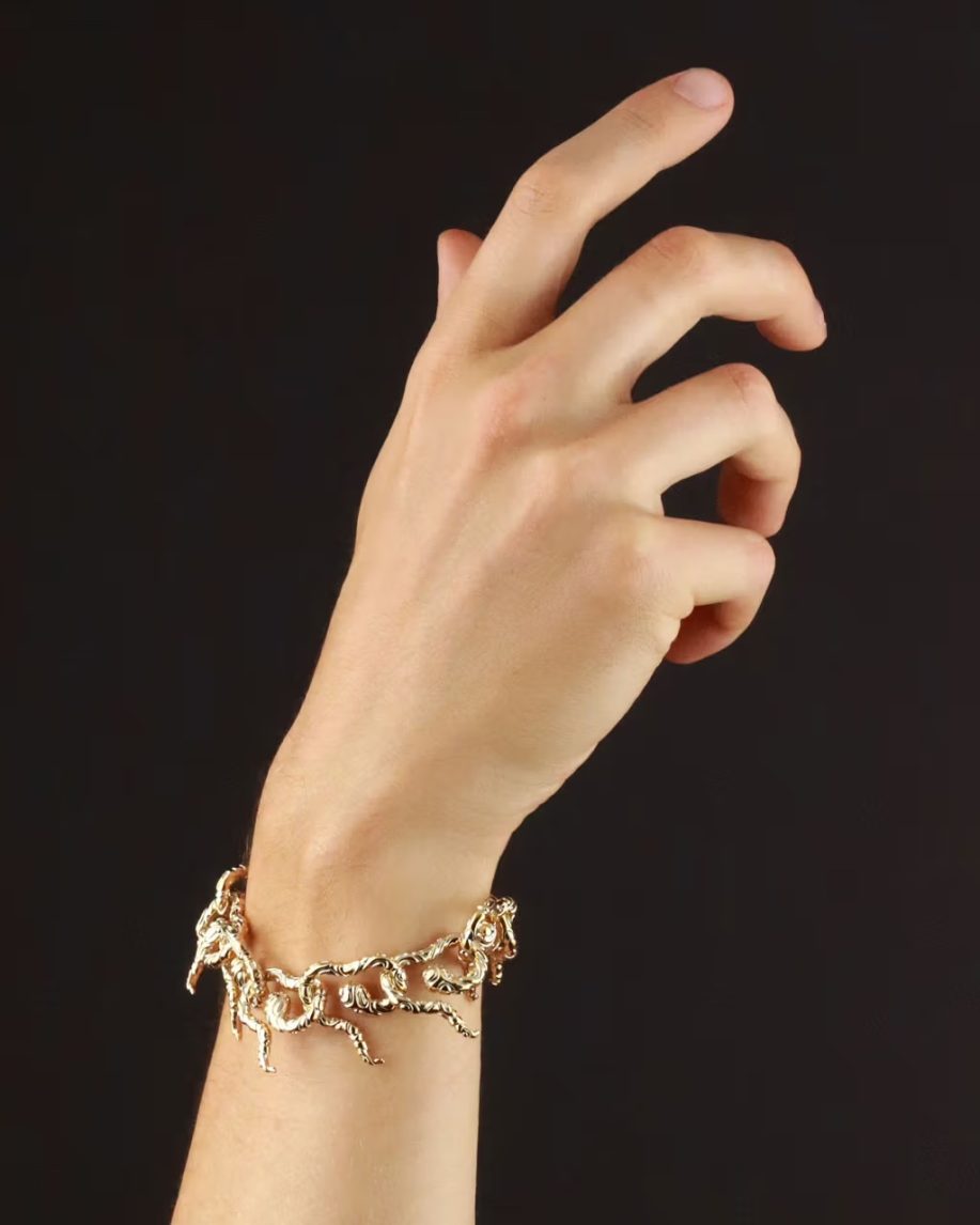 Within the collection, certain pieces stand out. The Baby Spore Earring cascades and spirals delicately from the ear with a pointed termination, while the Coil Earring extends in an undulating manner from beneath the ear, reminiscent of a serpent’s graceful movement. The Eternal Ring exhibits an organic, flowing shape that commands attention on the wearer’s finger. The Eternal Link Necklace and Bracelet showcase an abundance of intertwined serpents, each linked tail-to-tail.