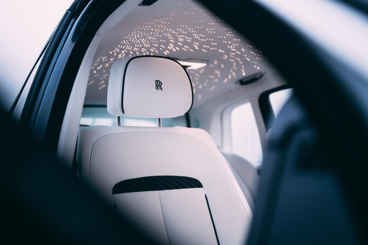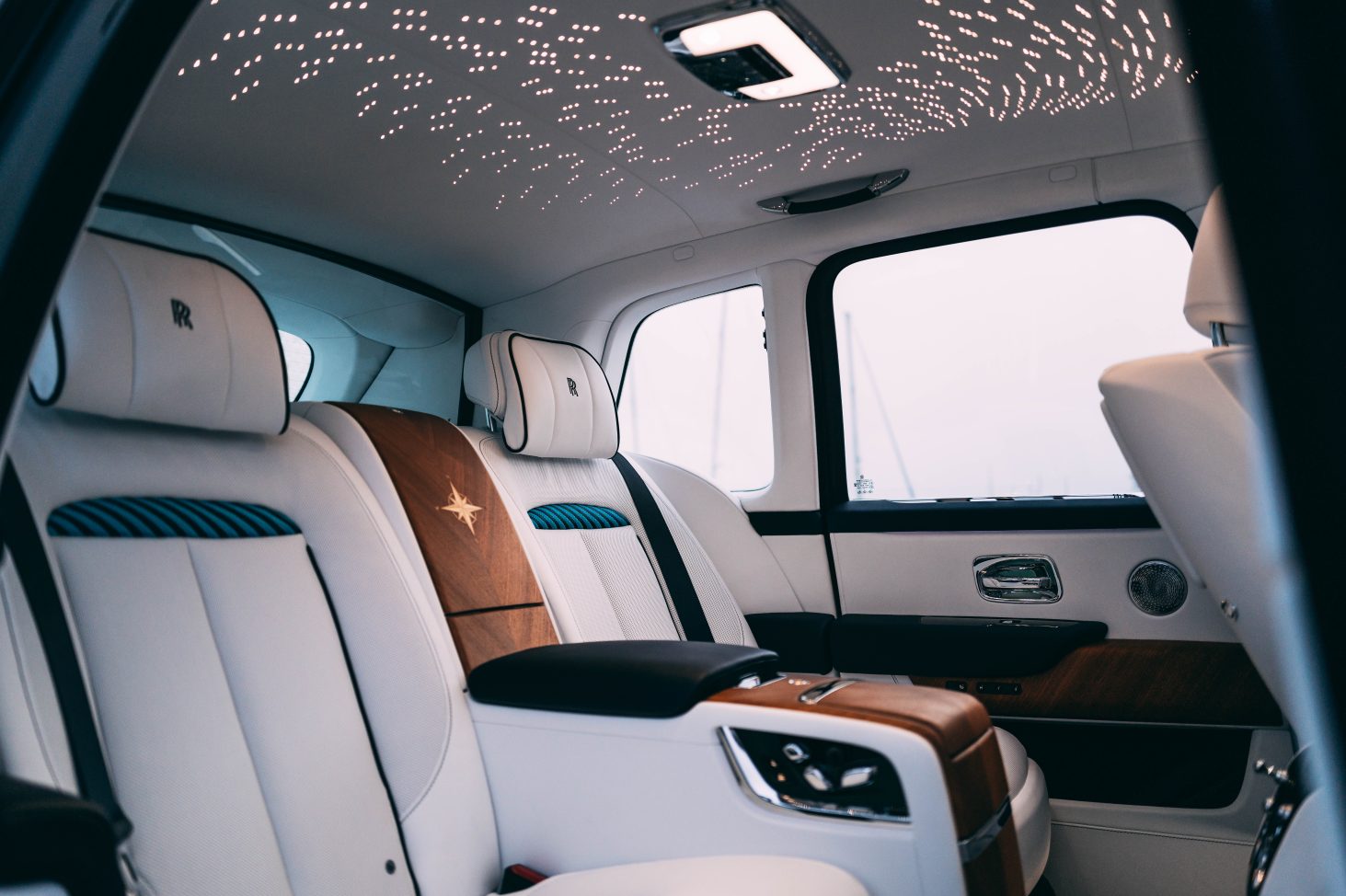 Inside the cabin the maritime aesthetic shifts into overdrive through truly meticulous craftsmanship. The interior space is heavily defined by stunning Open Pore Teak wood paired with striking two tone Arctic White and Navy Blue leather upholstery. Rolls-Royce completely elevated the bespoke details by including hand stitched rigging patterns across the seats and an intricate forty piece marquetry compass motif right on the rear waterfall console. The dashboard fascia boasts a gorgeous hand painted wake of a moving tender boat while the iconic Starlight Headliner is entirely reimagined. The ceiling animation now perfectly mimics Mediterranean wind maps using individually hand placed fiber optic stars.