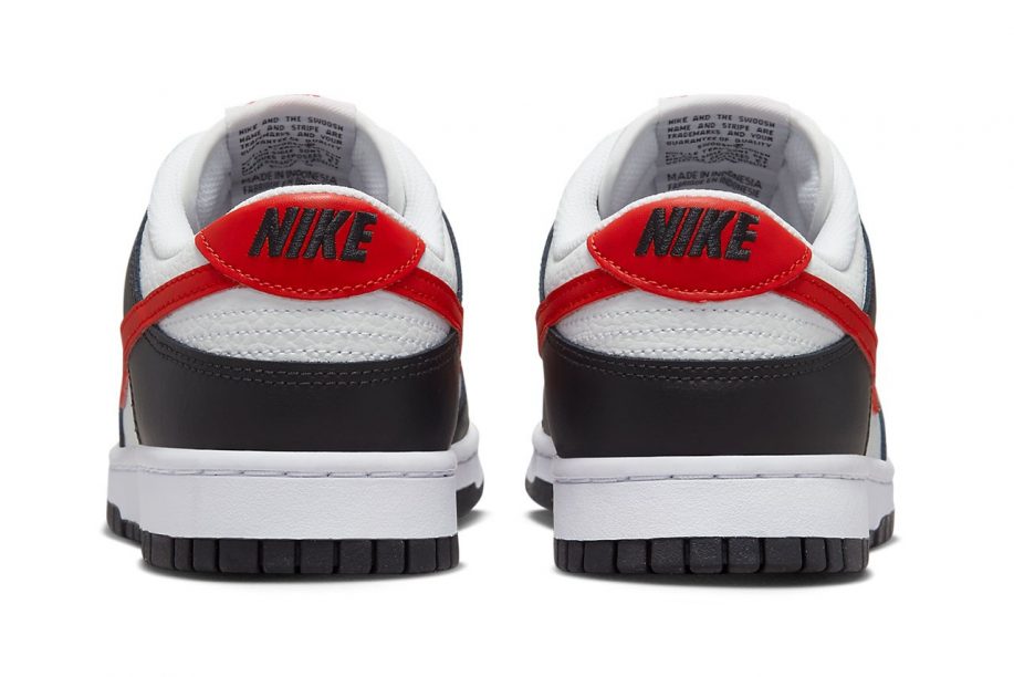 This latest Dunk Low channels the essence of the “Panda” with its black and white main build. The base layer here uses white tumbled leather – as opposed to the Panda’s smooth leather – beneath black smooth leather overlays. Nike injects a pop of color with eye-catching “University Red” Swooshes. Red appears again on the tongue tags and heel tab beneath Nike branding in black. Another minor disparity in this design is the white interior lining instead of the black seen in the original “Panda”. Down below, a white midsole rests above a black outsole to complete the design.